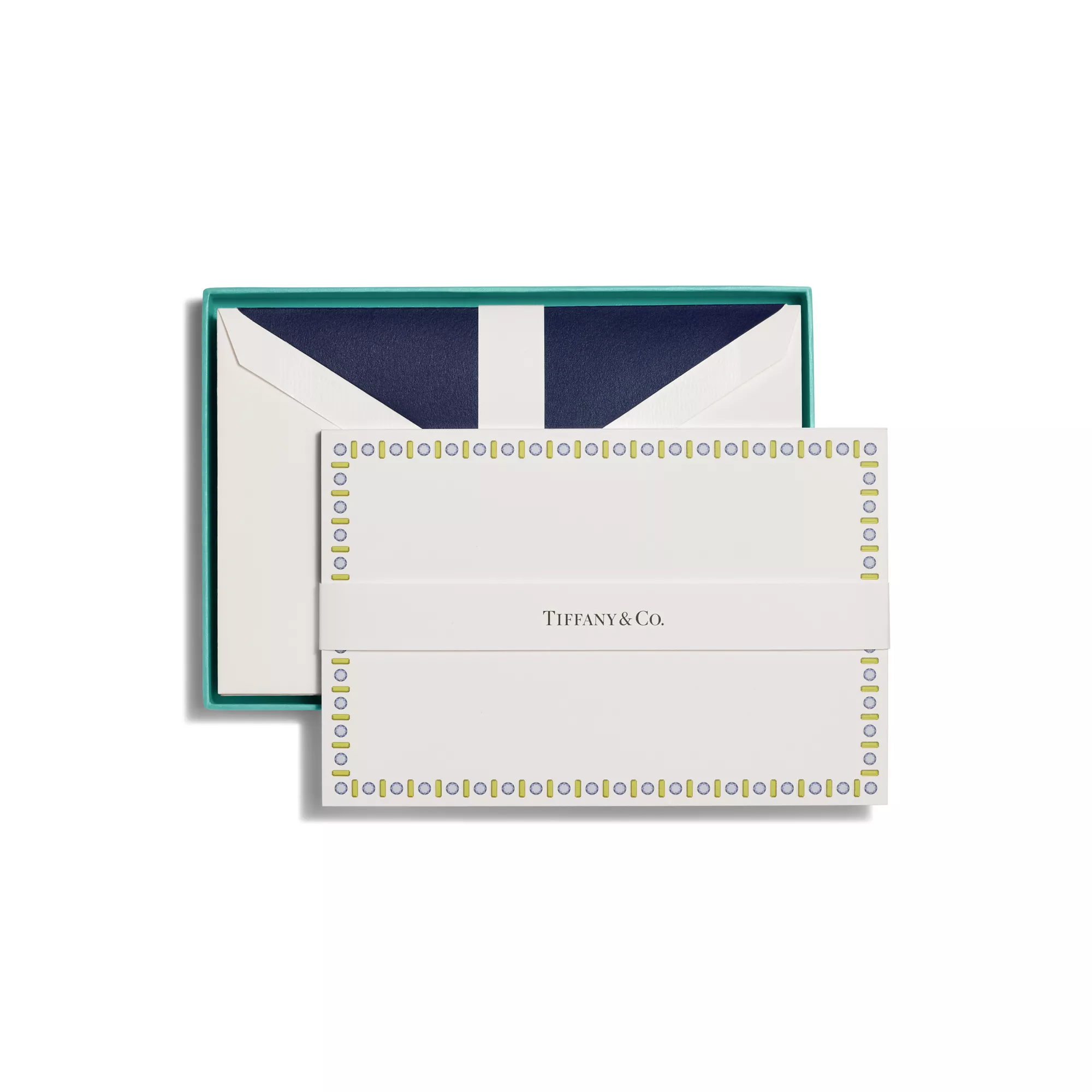 Tiffany Facets is inspired by the House’s ties to New York City and its legacy in the world of love and commitment, as well as its authority as the premier purveyor of exceptional diamonds and coloured gemstones. This notecard set features 12 blank cards with a jade-coloured gemstone motif border and corresponding jade-coloured lined envelopes.