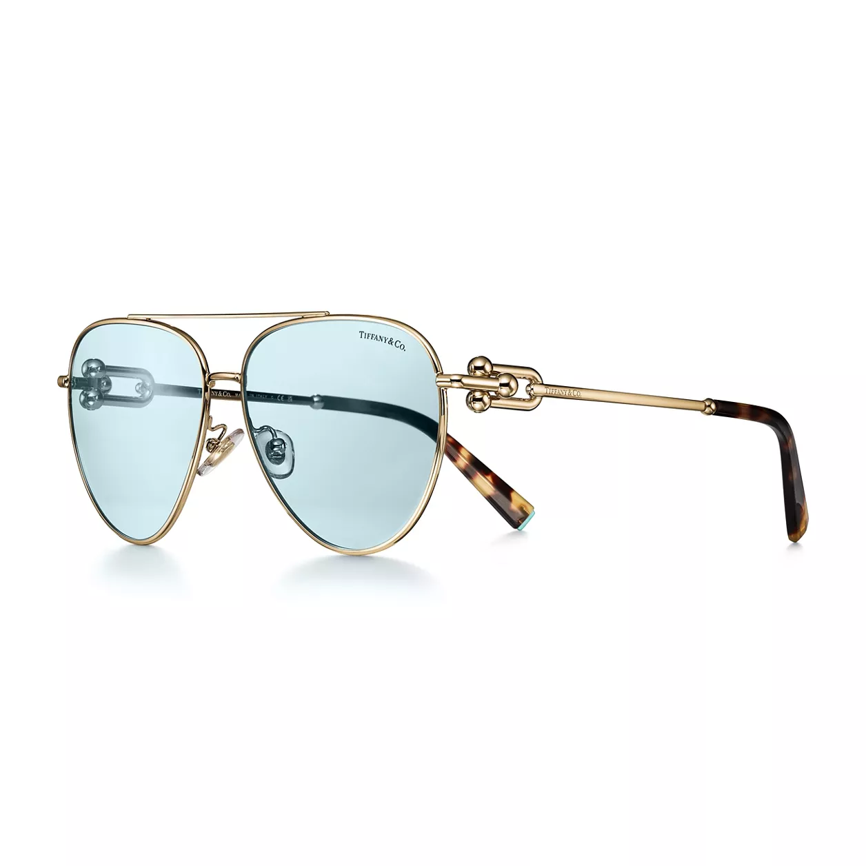 Tiffany HardWear is inspired by the attitude and energy of New York City. Drawing from the design codes that define the jewelry collection, these sunglasses feature the signature gauge link as a bold accent. Graphic and unexpected, the frames are meticulously crafted with pale gold-colored metal and Tiffany Blue® lenses.
