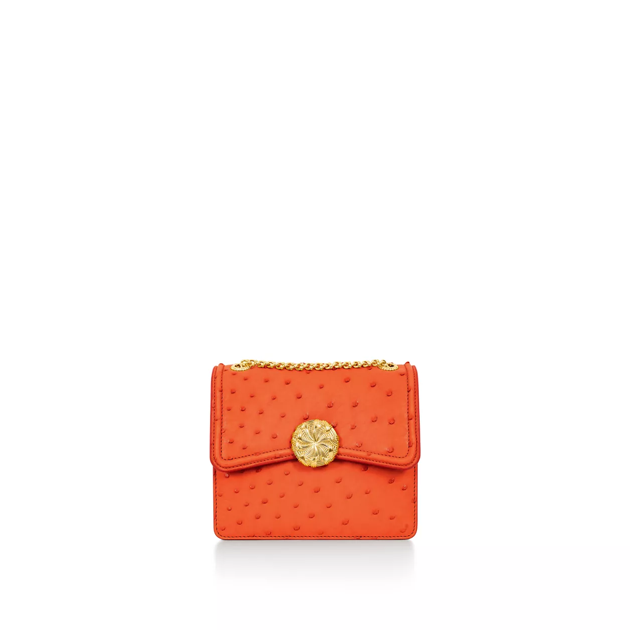 The Jean Schlumberger by Tiffany Ribbons collection is inspired by the legendary designer’s family history in the textile industry and the ornate trim he frequently incorporated into his creations. Crafted from ostrich leather, this bag features a front slip pocket lined with Tiffany Blue® and an interior back pocket with a removable mirror. The gold-plated brass closure nods to a motif seen on a compact mirror designed by Jean Schlumberger in 1957.