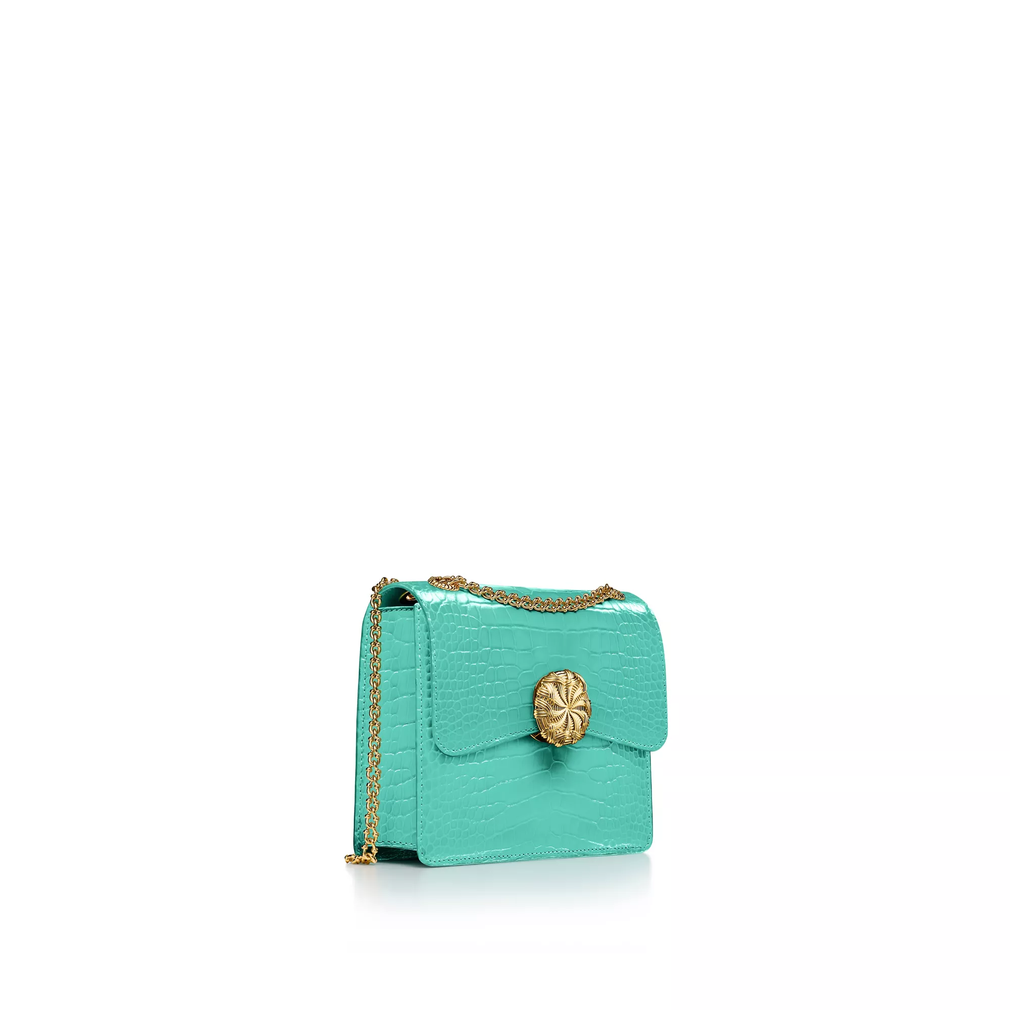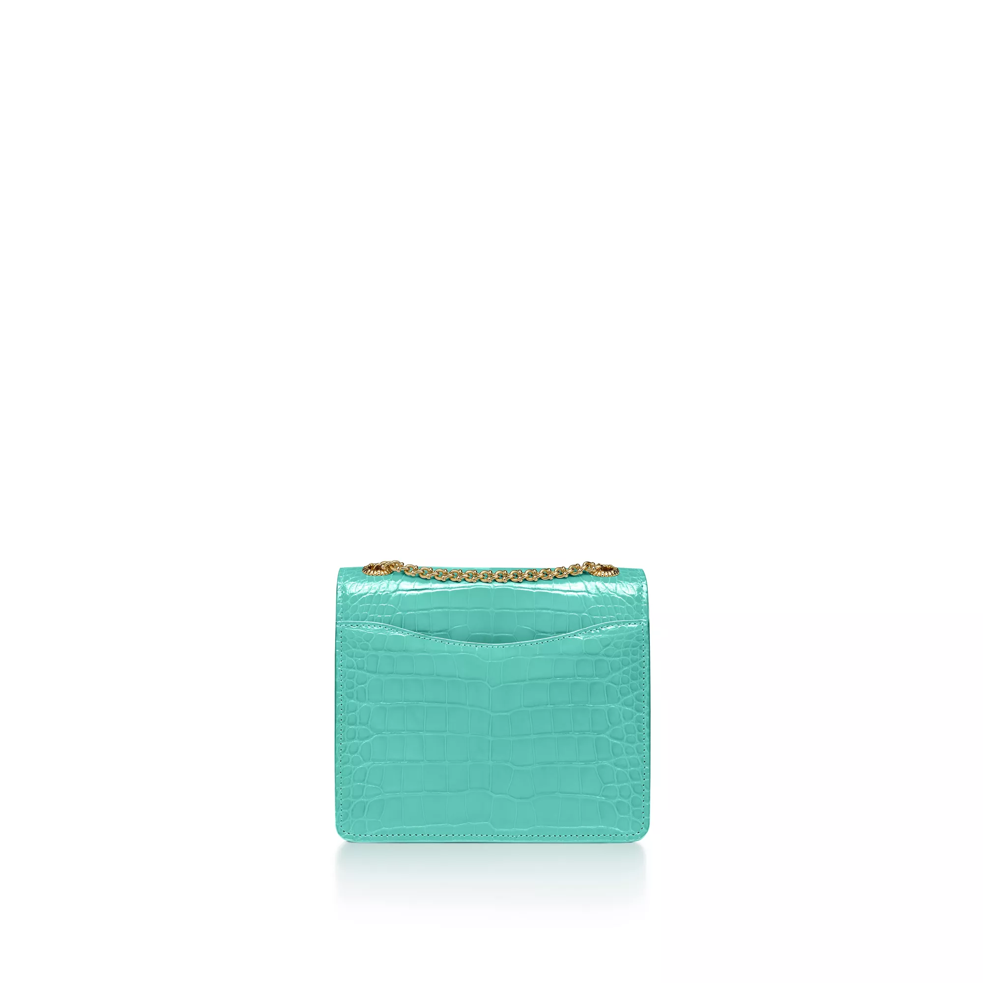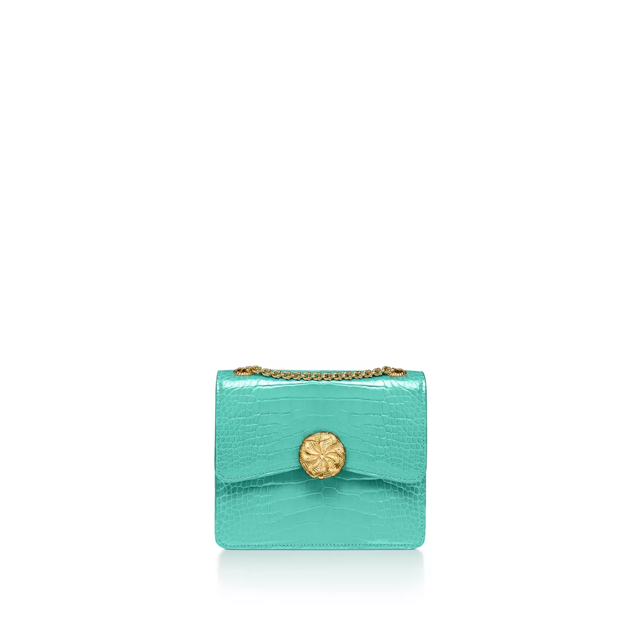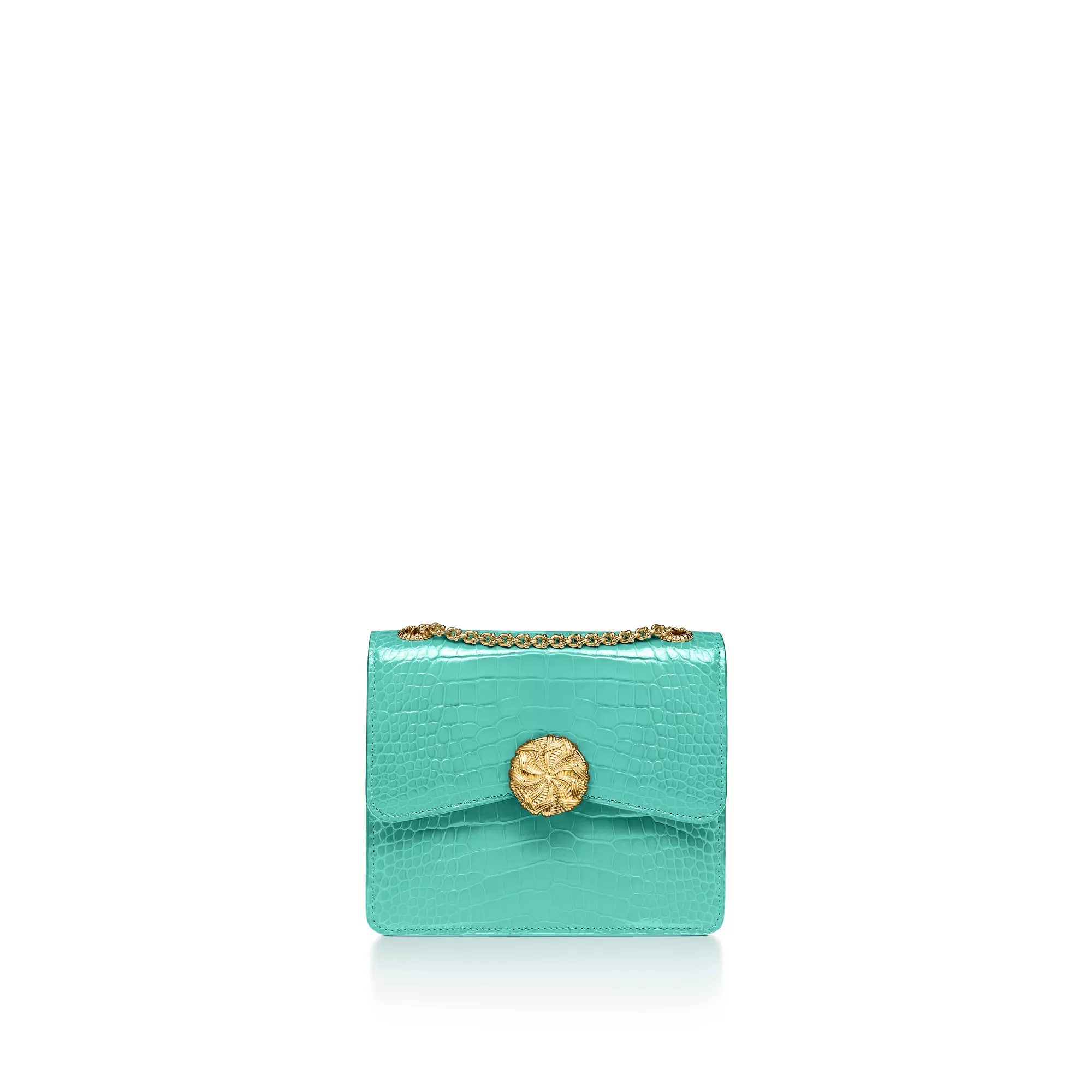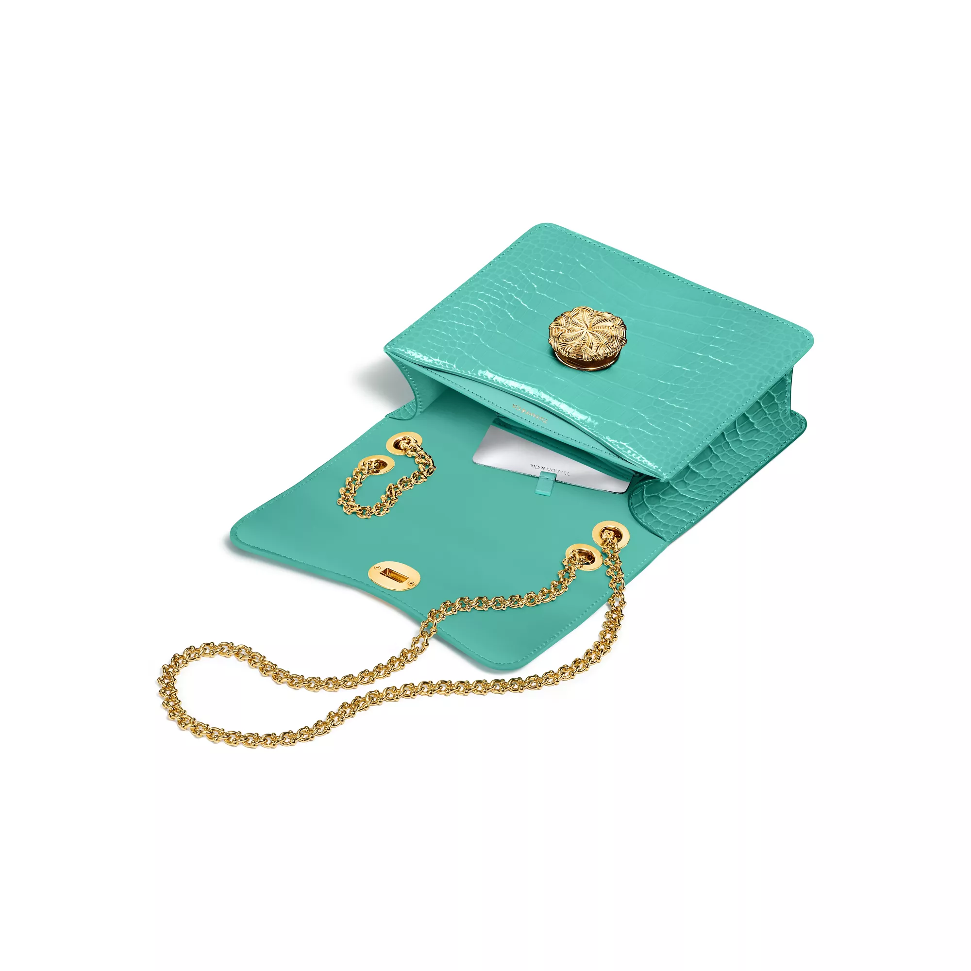 The Jean Schlumberger by Tiffany Ribbons collection is inspired by the legendary designer’s family history in the textile industry and the ornate trim he frequently incorporated into his creations. Crafted from alligator leather, this bag features a front slip pocket lined with Tiffany Blue® and an interior back pocket with a removable mirror. The gold-plated brass closure nods to a motif seen on a compact mirror designed by Jean Schlumberger in 1957.