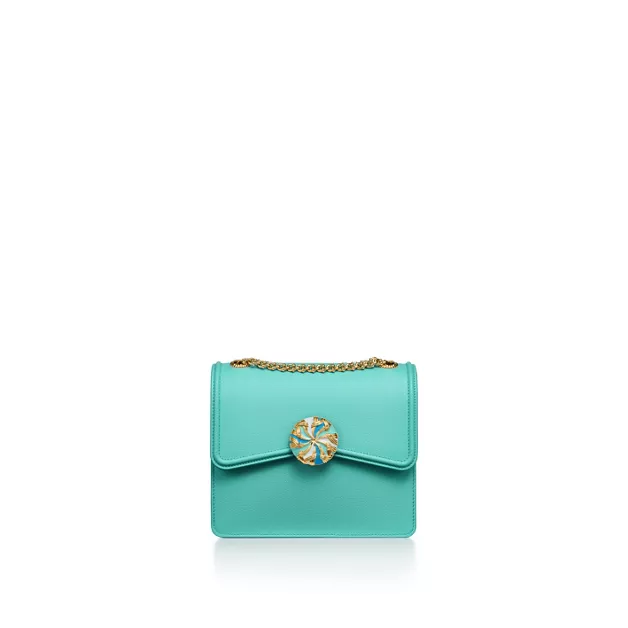 The Jean Schlumberger by Tiffany Ribbons collection is inspired by the legendary designer’s family history in the textile industry and the ornate trim he frequently incorporated into his creations. Crafted from grained calf leather, this bag features a front slip pocket lined with Tiffany Blue® and an interior back pocket with a removable mirror. The Tiffany Blue® enamel and gold-plated brass closure nods to a motif seen on a compact mirror designed by Jean Schlumberger in 1957.