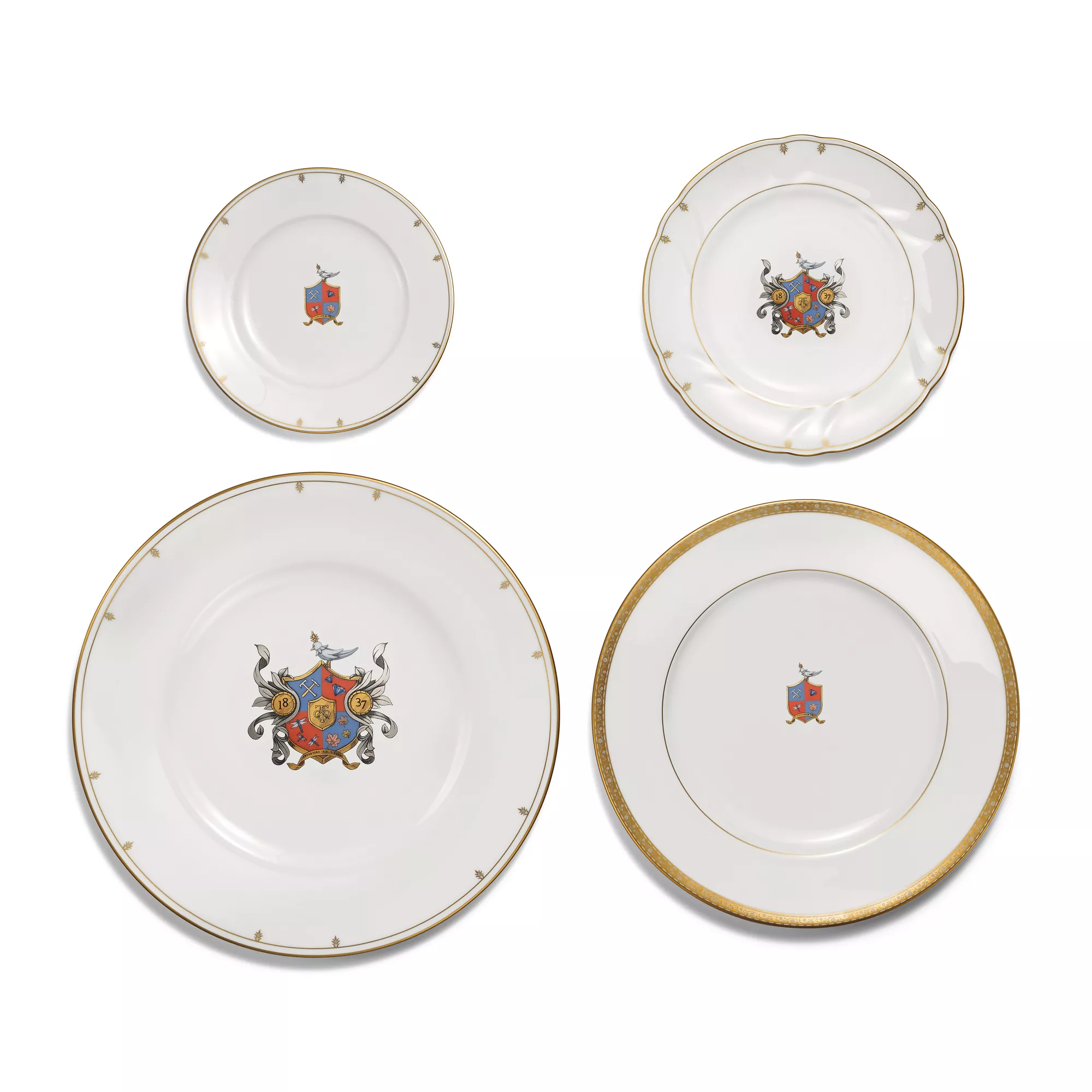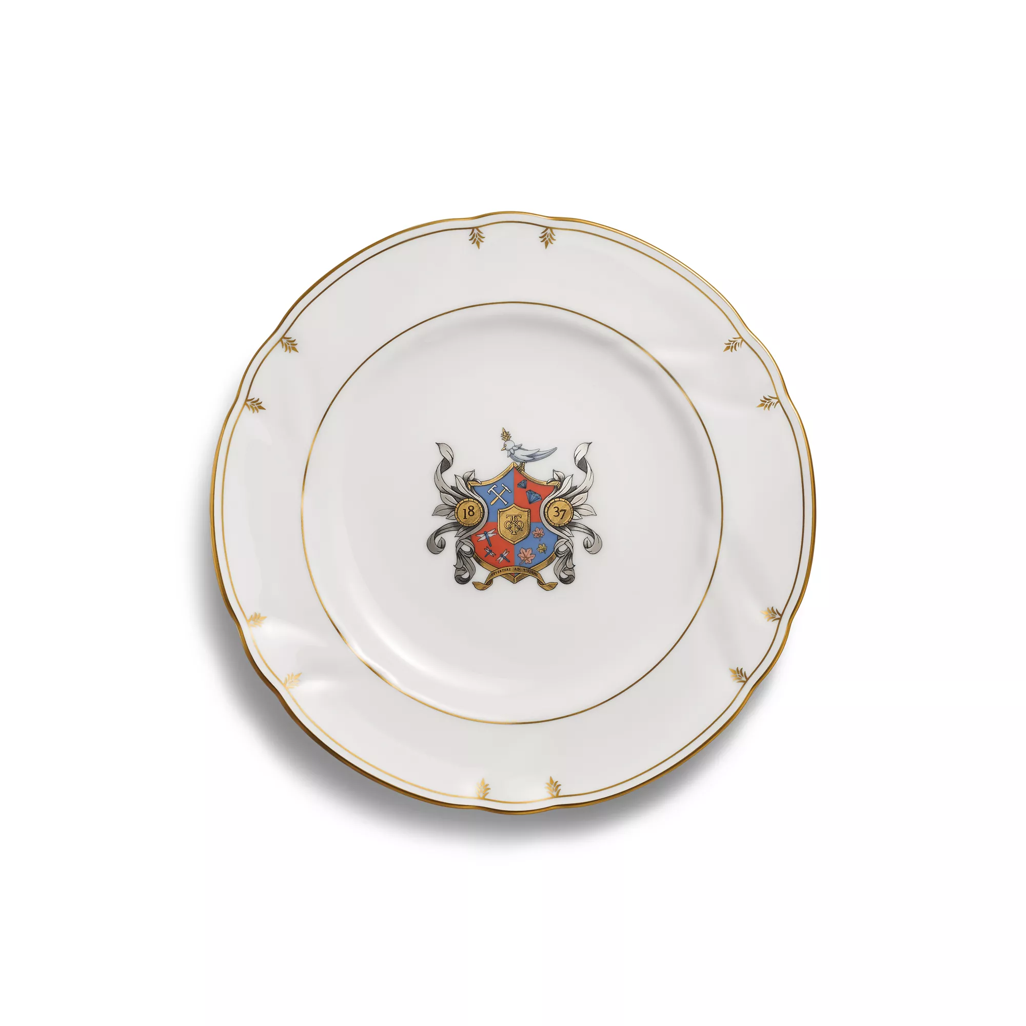 Tiffany Crest designs celebrate the House’s heritage with an elegant coat of arms adorned with our most iconic symbols. Perched on the crest is Jean Schlumberger’s renowned Bird on a Rock motif. The shield features a silversmith’s hammer and anvil in the shape of a T that honours our artisanal craftsmanship. Diamonds pay tribute to our legacy of offering the finest gemstones in the world. Dragonflies, one of the earliest emblems of the House, are inspired by masterpieces from The Tiffany Archives. Sugar maple leaves represent the state tree of New York, while the orange and blue colours evoke our hometown New York City’s official flag. Featured at the bottom, the Latin motto “Revertere Ad Tiffany” translates to “Return to Tiffany”— a nod to the signature phrase of our beloved Return to Tiffany™ collection. Style with pieces from the Tiffany Crest collection for a matching look or mix with our other dinnerware patterns for a striking table setting.