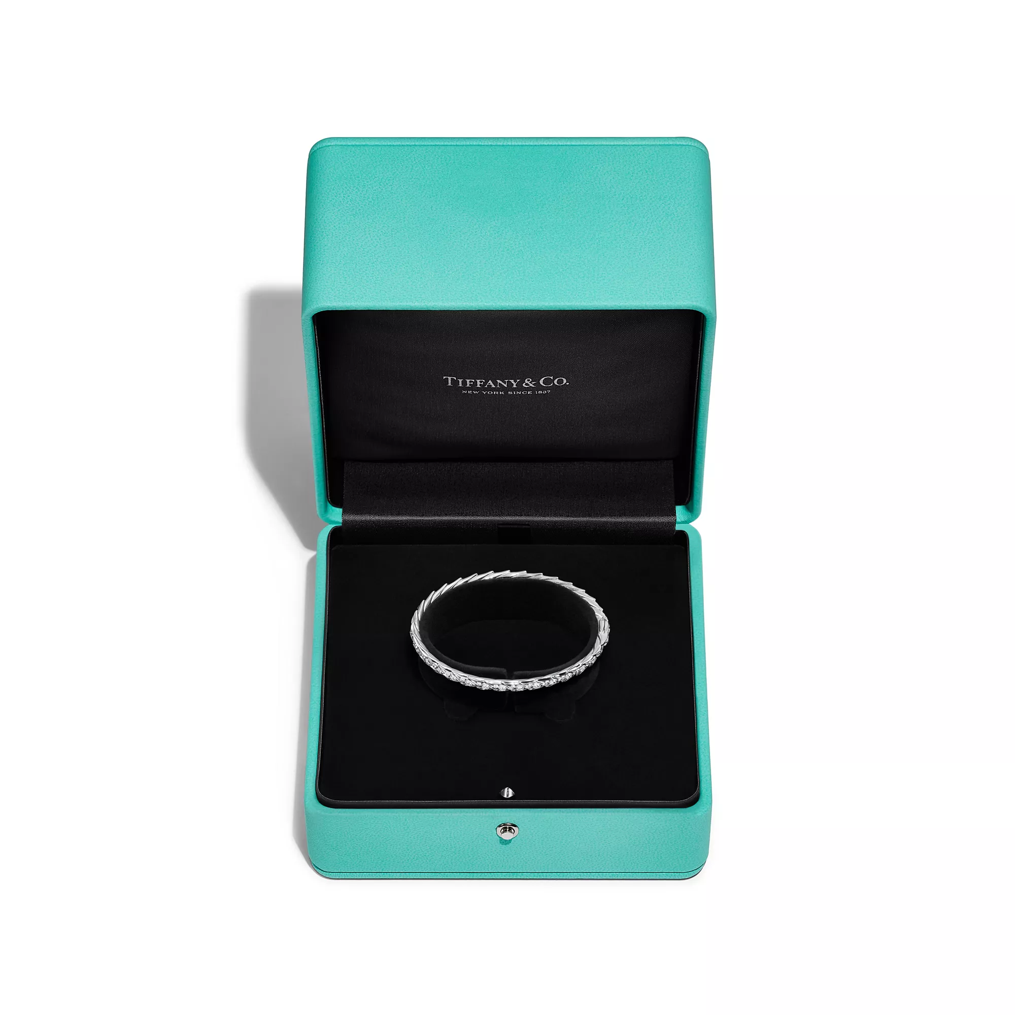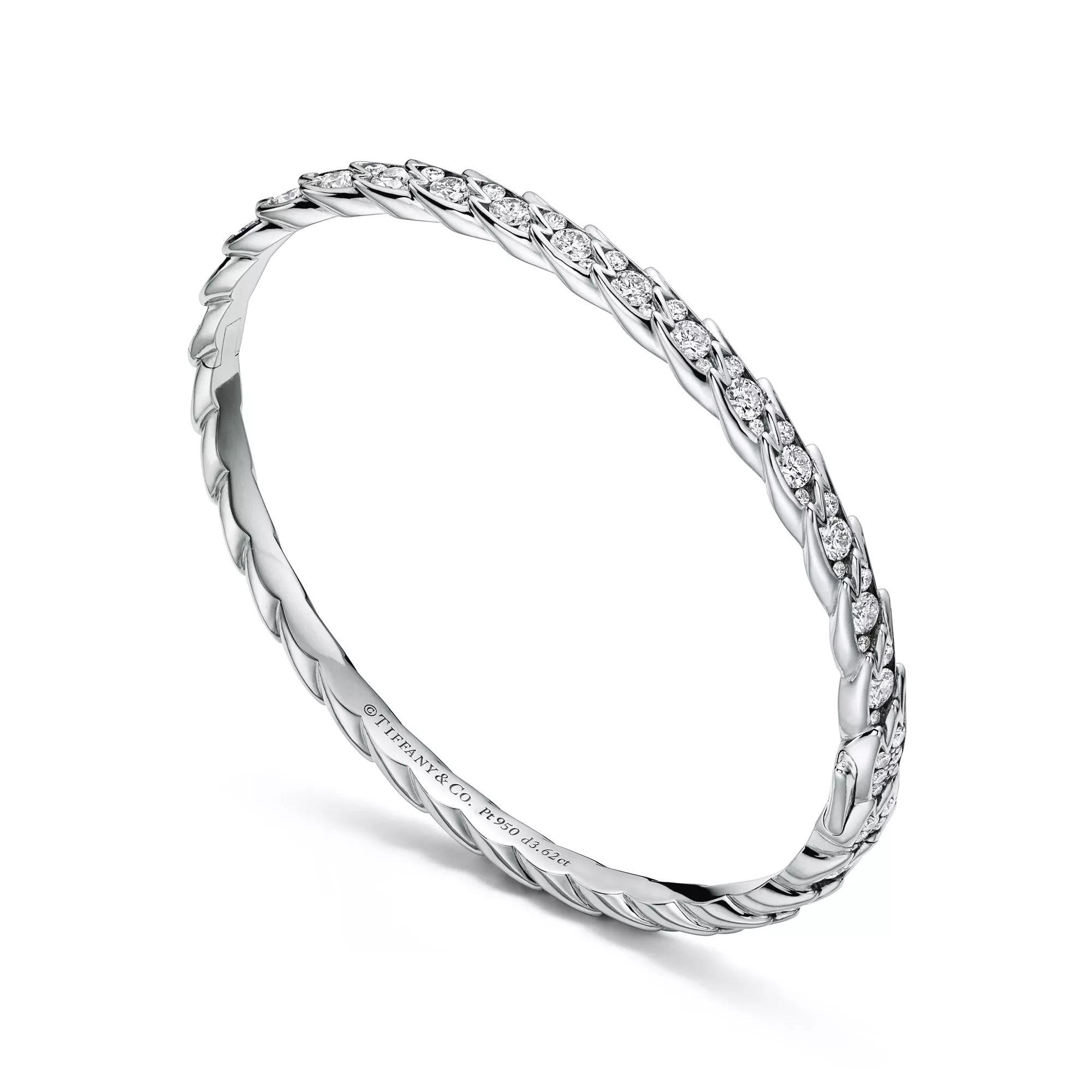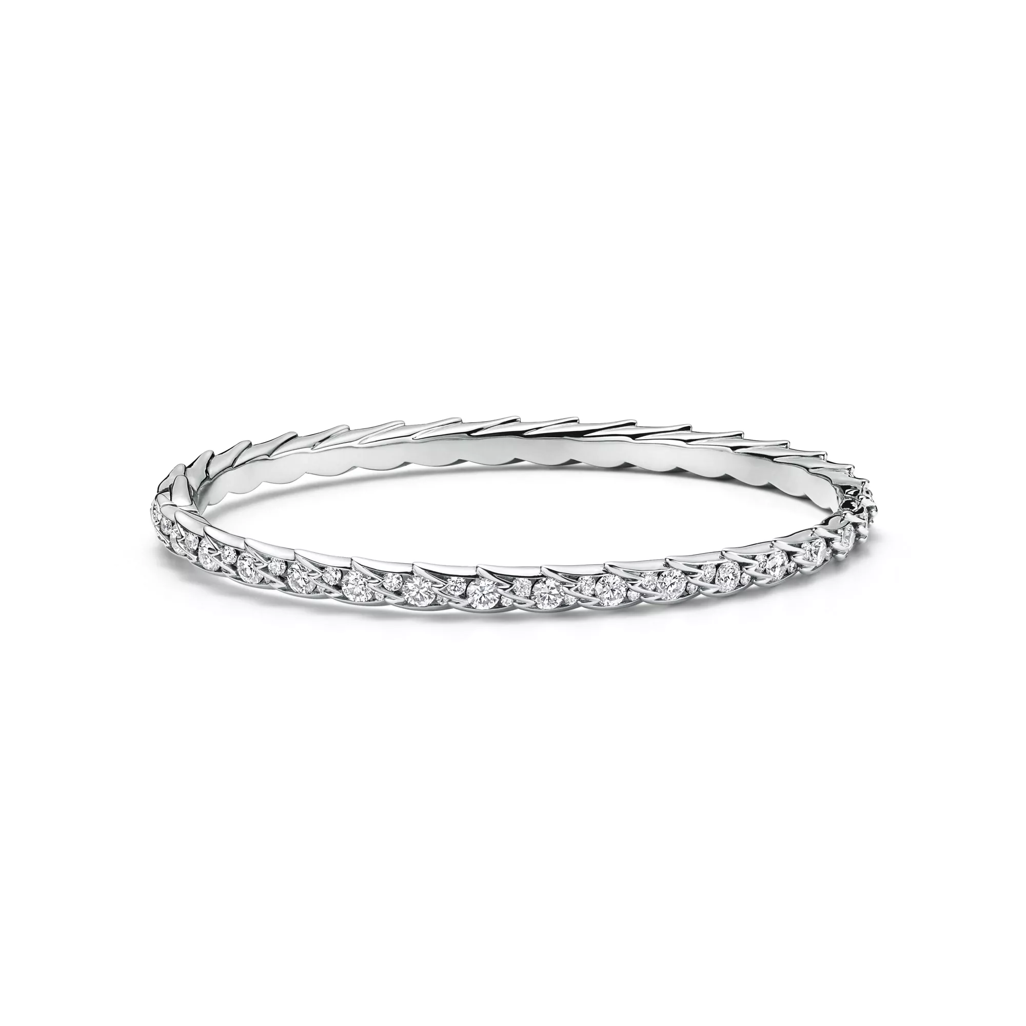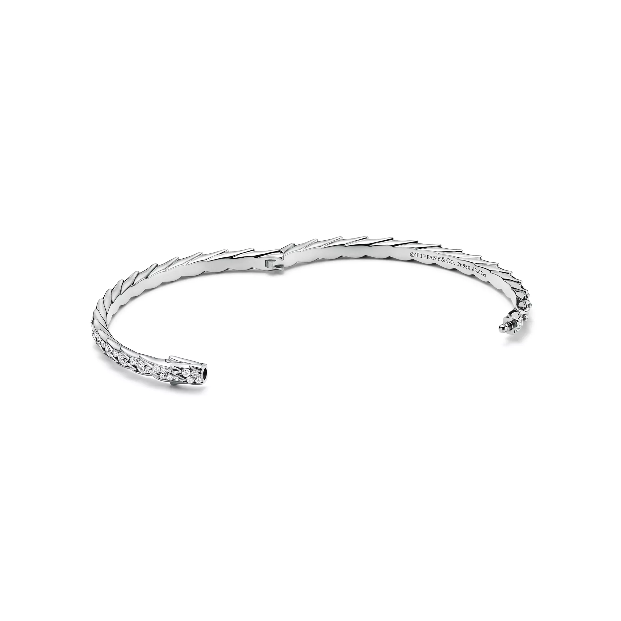 Bird on a Rock by Tiffany is an expression of love’s soaring optimism. This abstract motif has no visible setting, showcasing the purity of the wing as if swept by the wind. Meticulously crafted using specialised high jewellery techniques, this luminous platinum bangle showcases bold, sculptural feathers. Each design captures the graceful movement found in nature, brought to life through a delicate balance of brilliant diamonds and precious metals. When stacked, the edges of one piece perfectly nestle with the feather-shaped silhouette of the other. The motif embraces the avant-garde artistry of Jean Schlumberger’s original Bird on a Rock brooch as it transforms into a bold, textural creation.