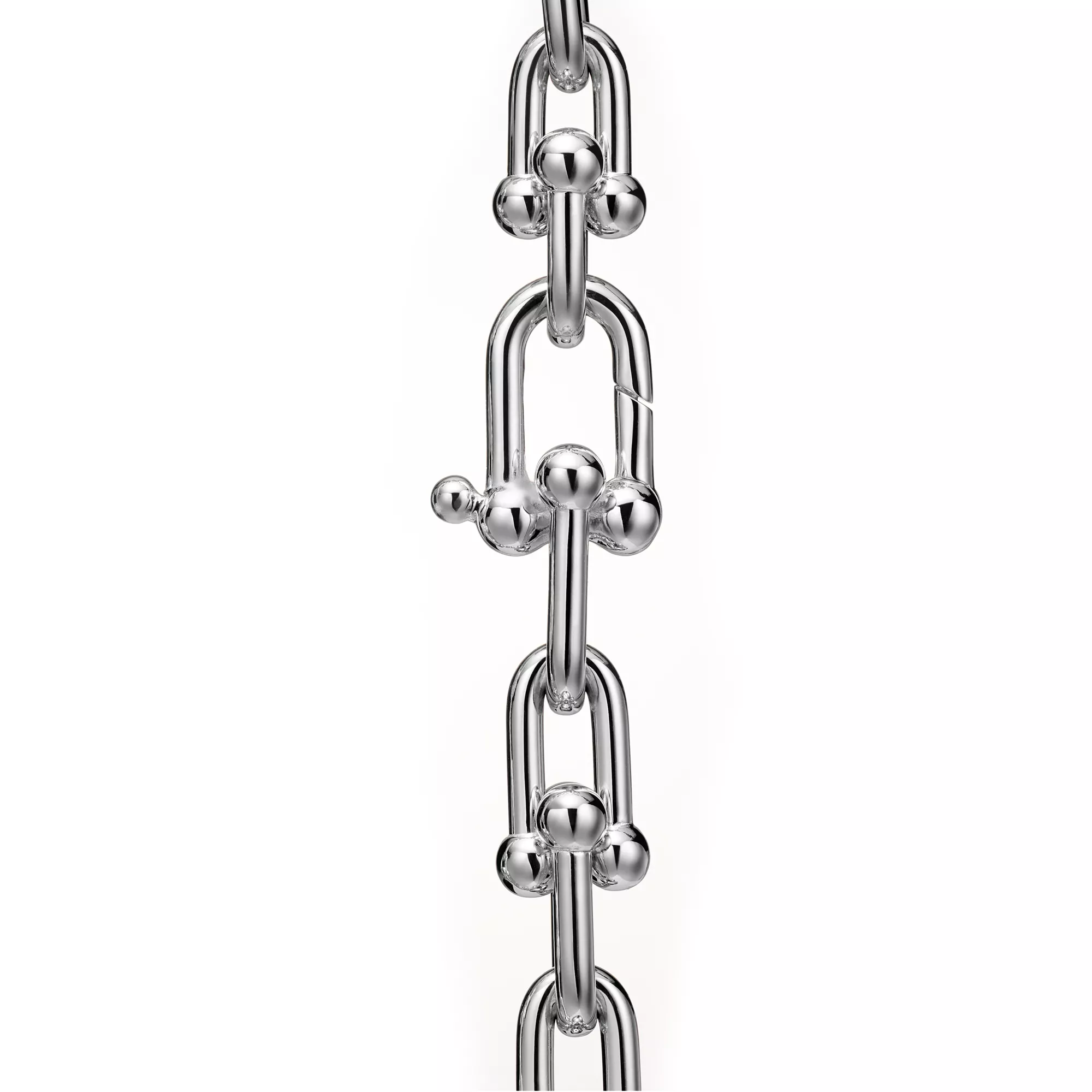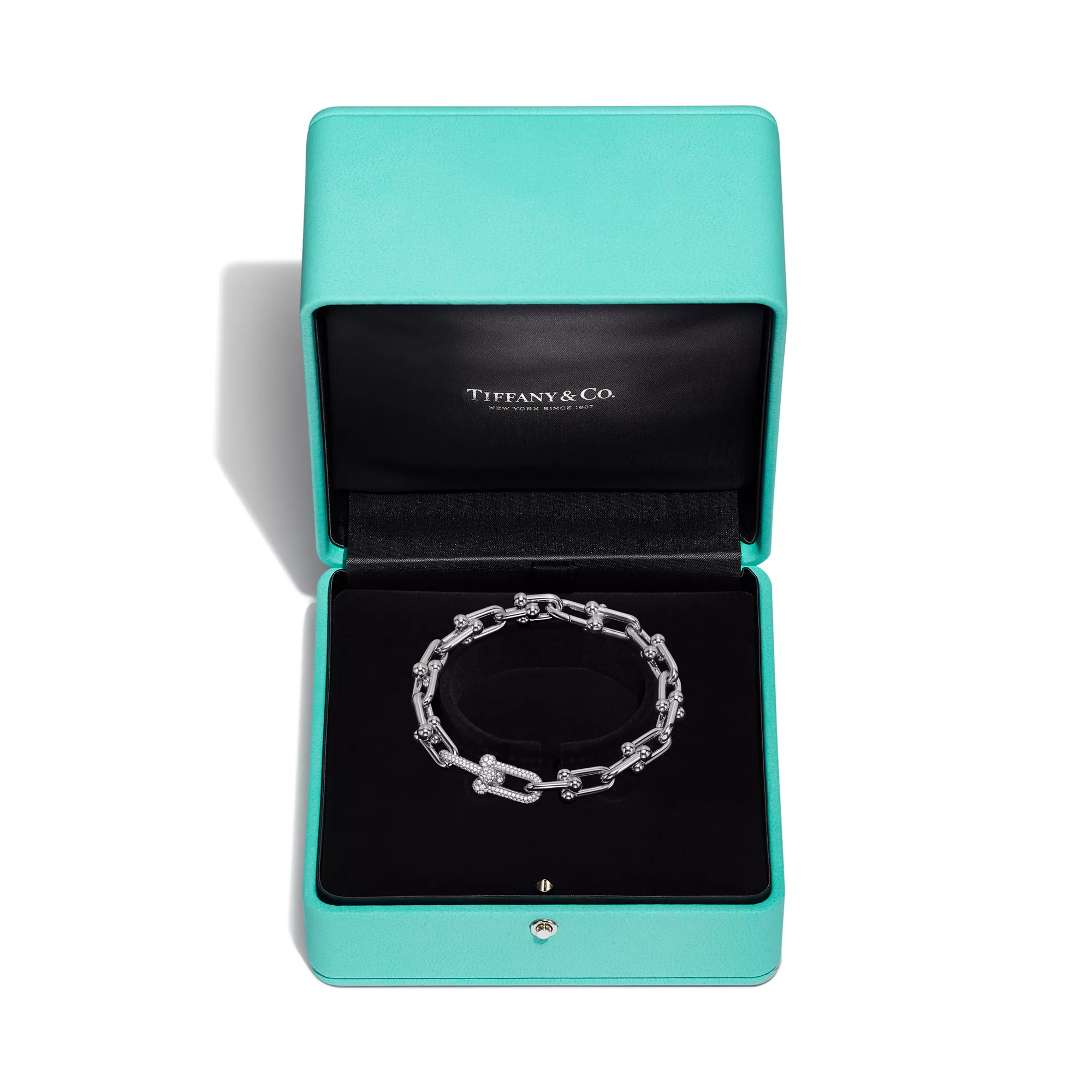 Tiffany HardWear is an expression of love’s transformative strength. Inspired by a quintessential bracelet from 1962 found in the House’s archives, HardWear embodies enduring resilience and uninhibited spirit. Playing with tension, proportion and colour, this bold design highlights the collection’s signature gauge links crafted in 18k white gold, with two links featuring pavé diamonds. Wear this bracelet on its own or mixed with other metals for an unexpected contrast of shades.