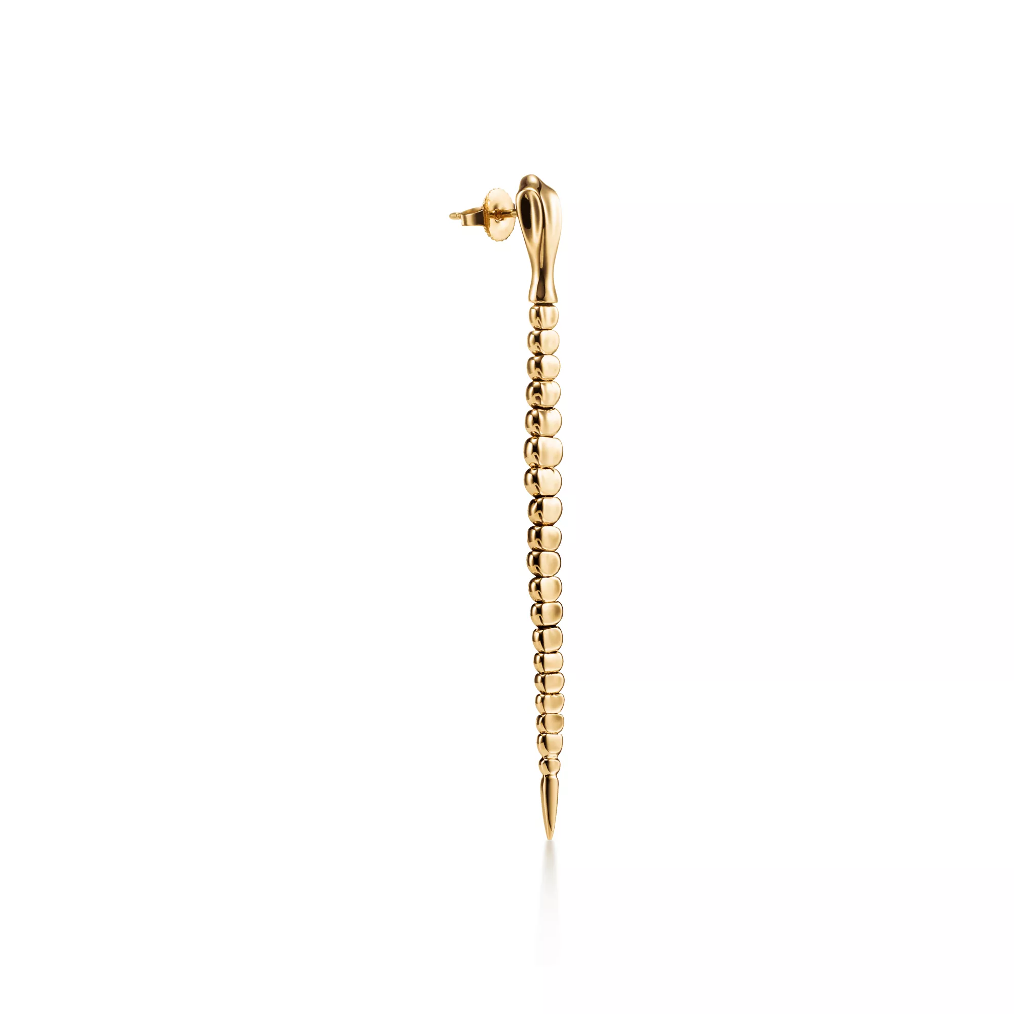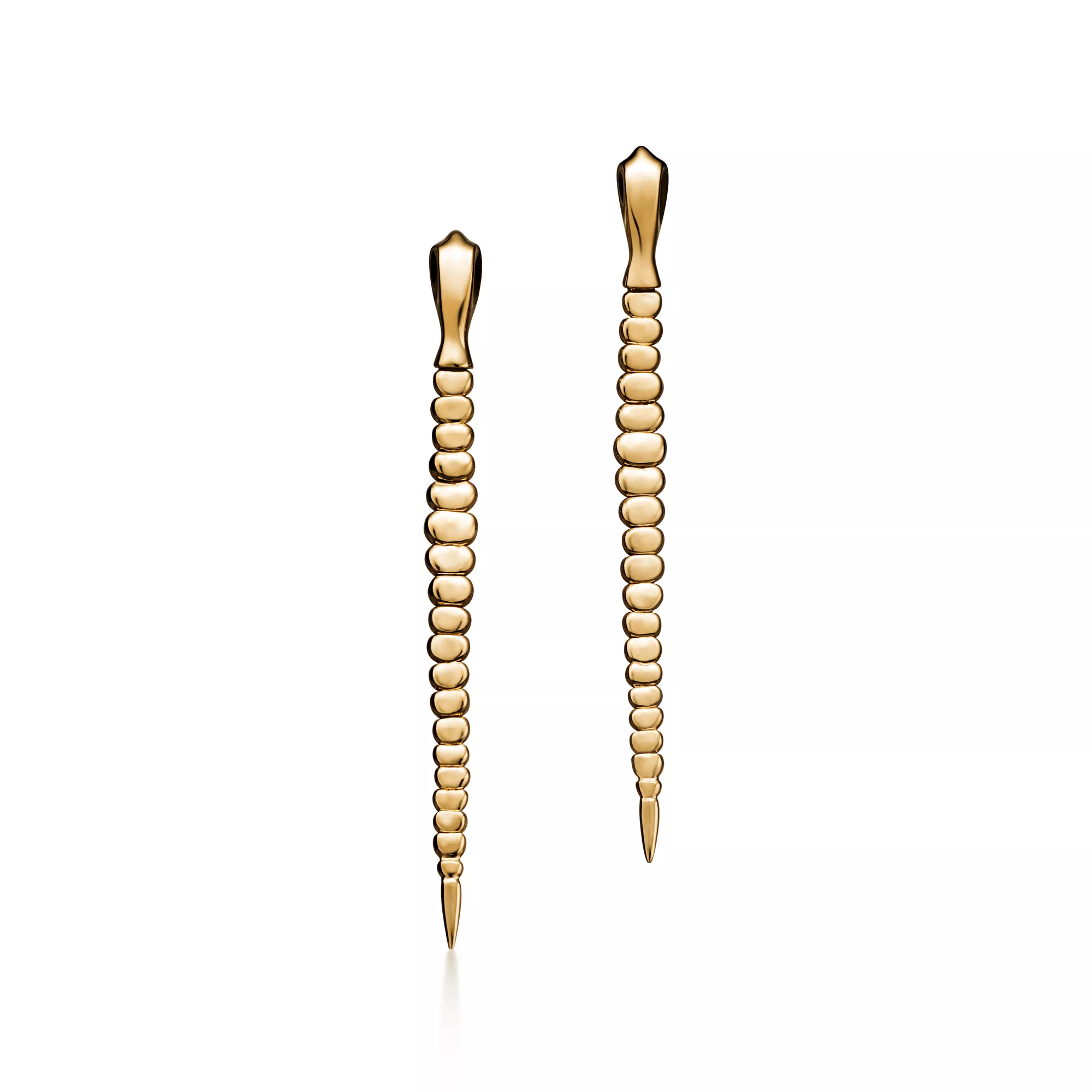 Elsa Peretti® Snake designs are inspired by a token of good luck gifted to the artist. The ingenious design and craftsmanship of the serpentine form carries streamlined fluidity, sculpting to its wearer effortlessly. Wear these alluring 18k yellow gold earrings by themselves for a striking look.