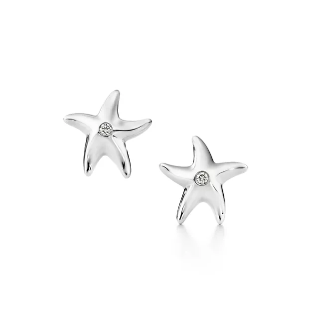 The starfish evokes life beneath the waves and in the celestial heavens. Earrings with round brilliant diamonds in sterling silver, for pierced ears. 12 mm wide. Carat total weight .04. Original designs copyrighted by the Nando and Elsa Peretti Foundation.