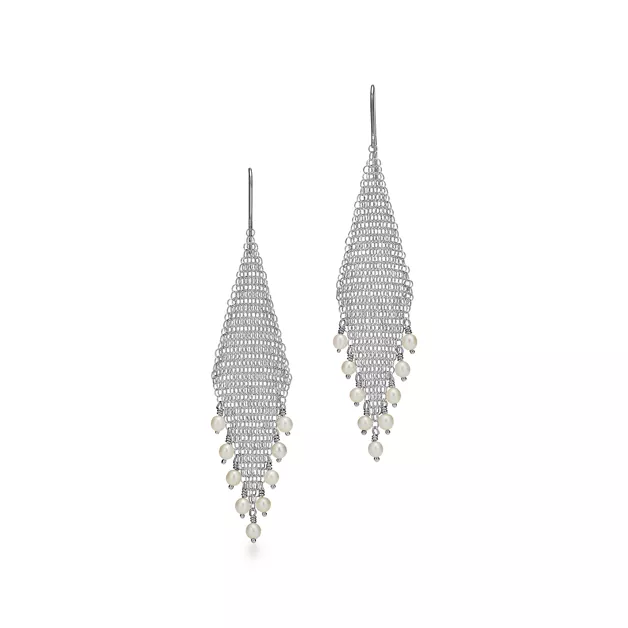 The form is malleable and ergonomic in the way it drapes over the body's contours. Fringe earrings in sterling silver with freshwater cultured pearls. 2.75" long. Pearls, 2.5-3mm. Original designs copyrighted by the Nando and Elsa Peretti Foundation.