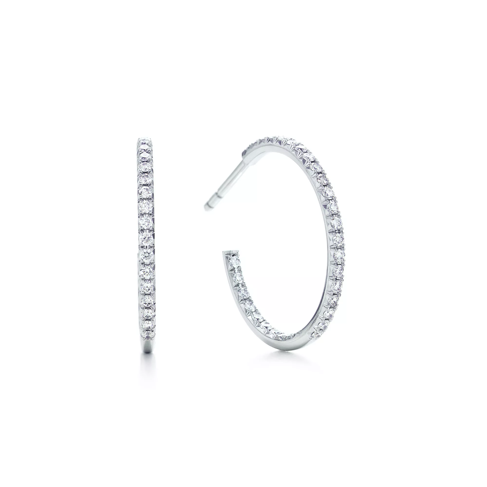 Streamlined and modern, the Tiffany Metro collection twinkles like a nighttime city skyline. Dazzling diamonds trace the classic shape of these hoop earrings.