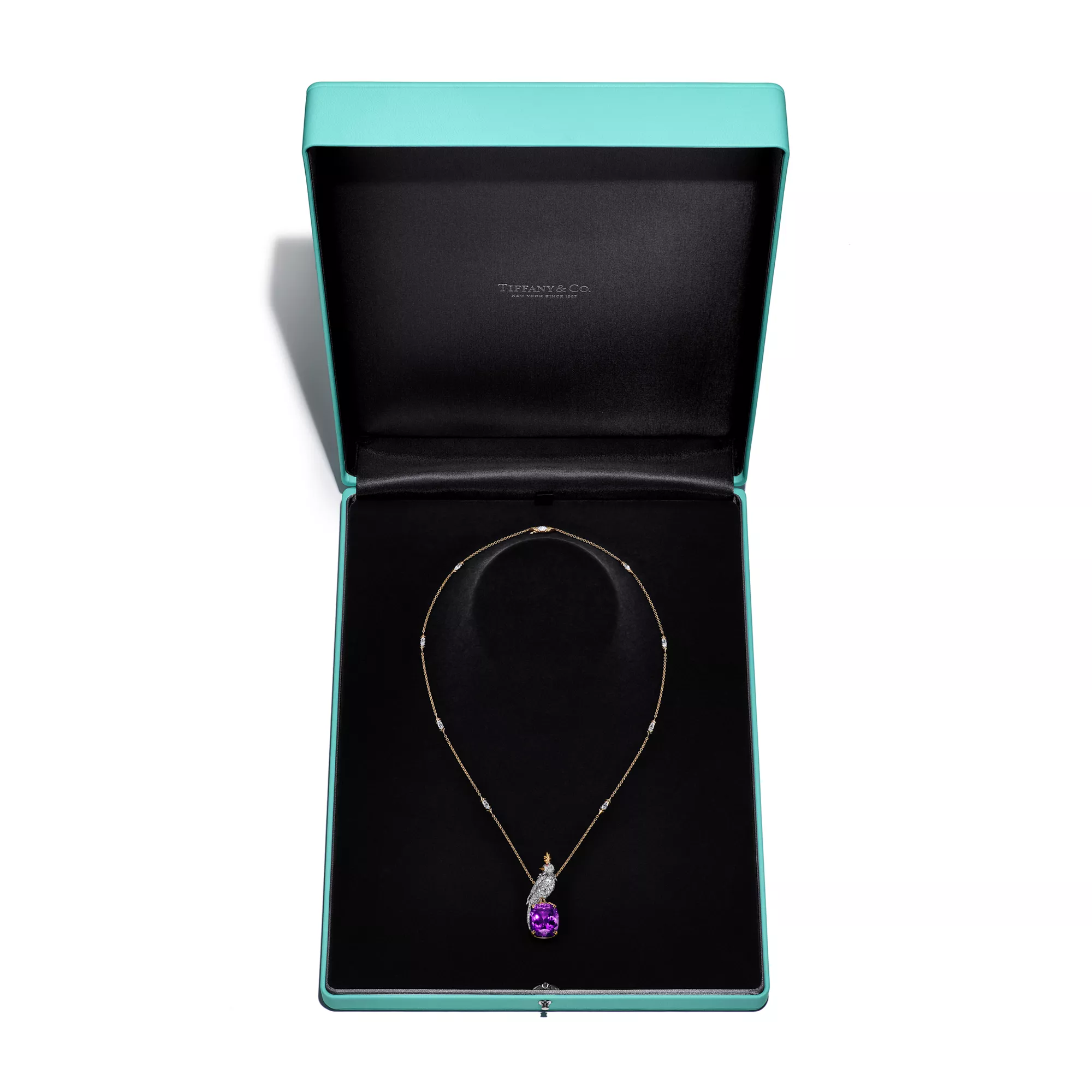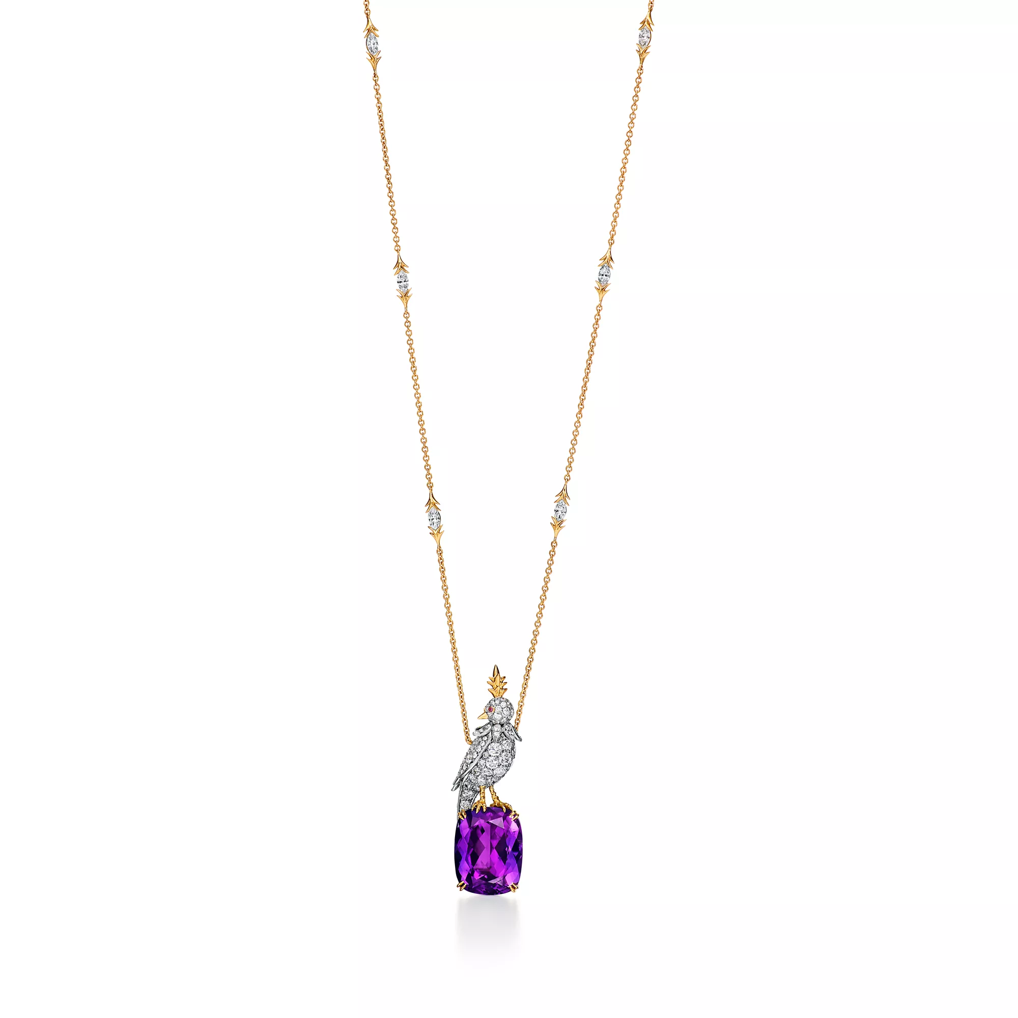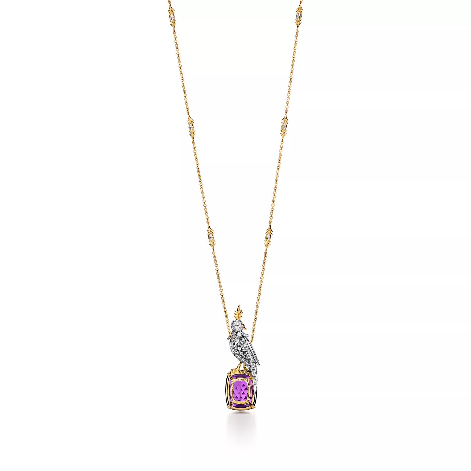 Bird on a Rock is one of the House’s most emblematic creations. Created by Jean Schlumberger for Tiffany & Co. in 1965, the diamond-encrusted bird is a symbol of joy, optimism and wonder. Today, the celebrated brooch transforms into an array of pendants. Epitomising the unrivaled craftsmanship for which Tiffany is known, every gemstone for each Bird on a Rock is hand selected and hand set by our artisans. This 18k yellow gold and platinum pendant features a bird set with diamonds and pink sapphires on a cushion-cut amethyst "rock."