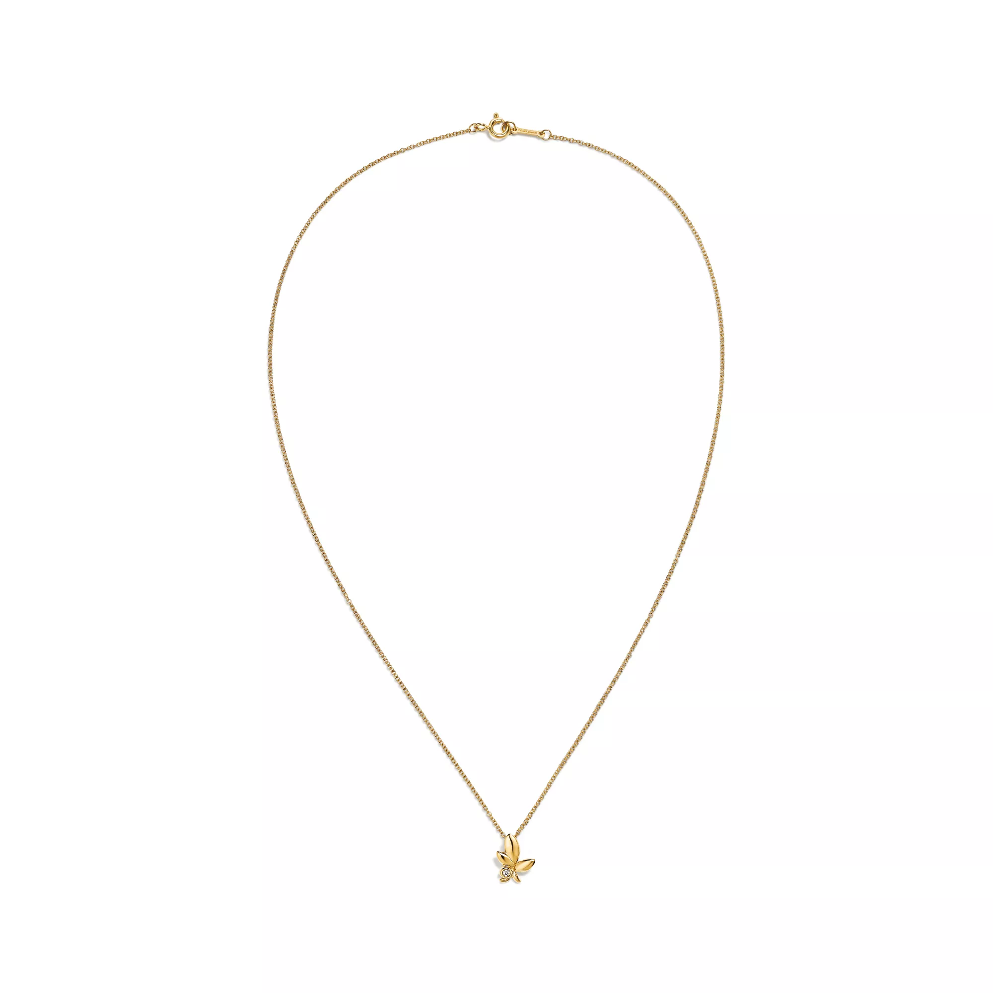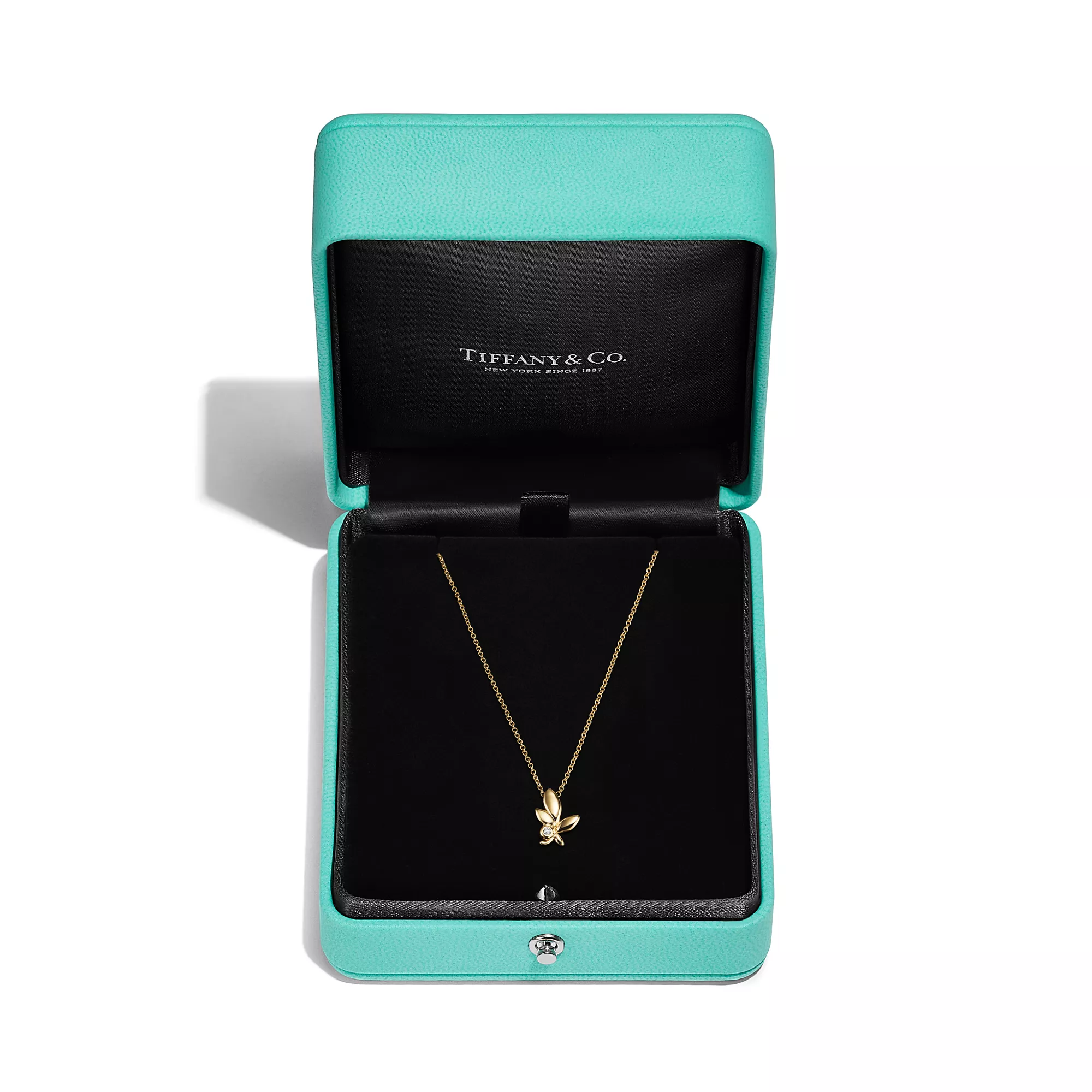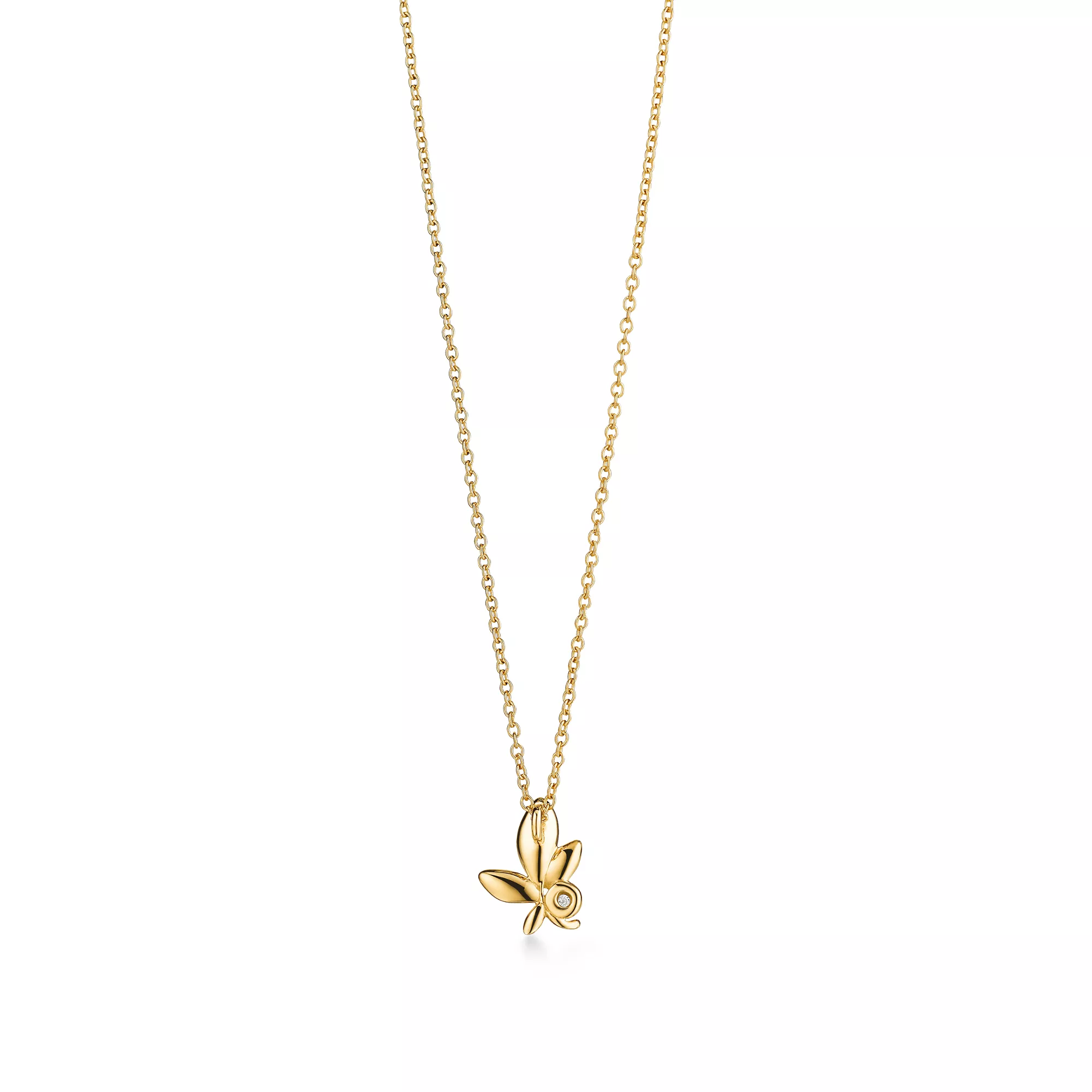 Inspired by the olive branch, a symbol of peace and abundance. In 18k gold with a round brilliant diamond. Size mini, on a 16" chain. Original designs copyrighted by Paloma Picasso.