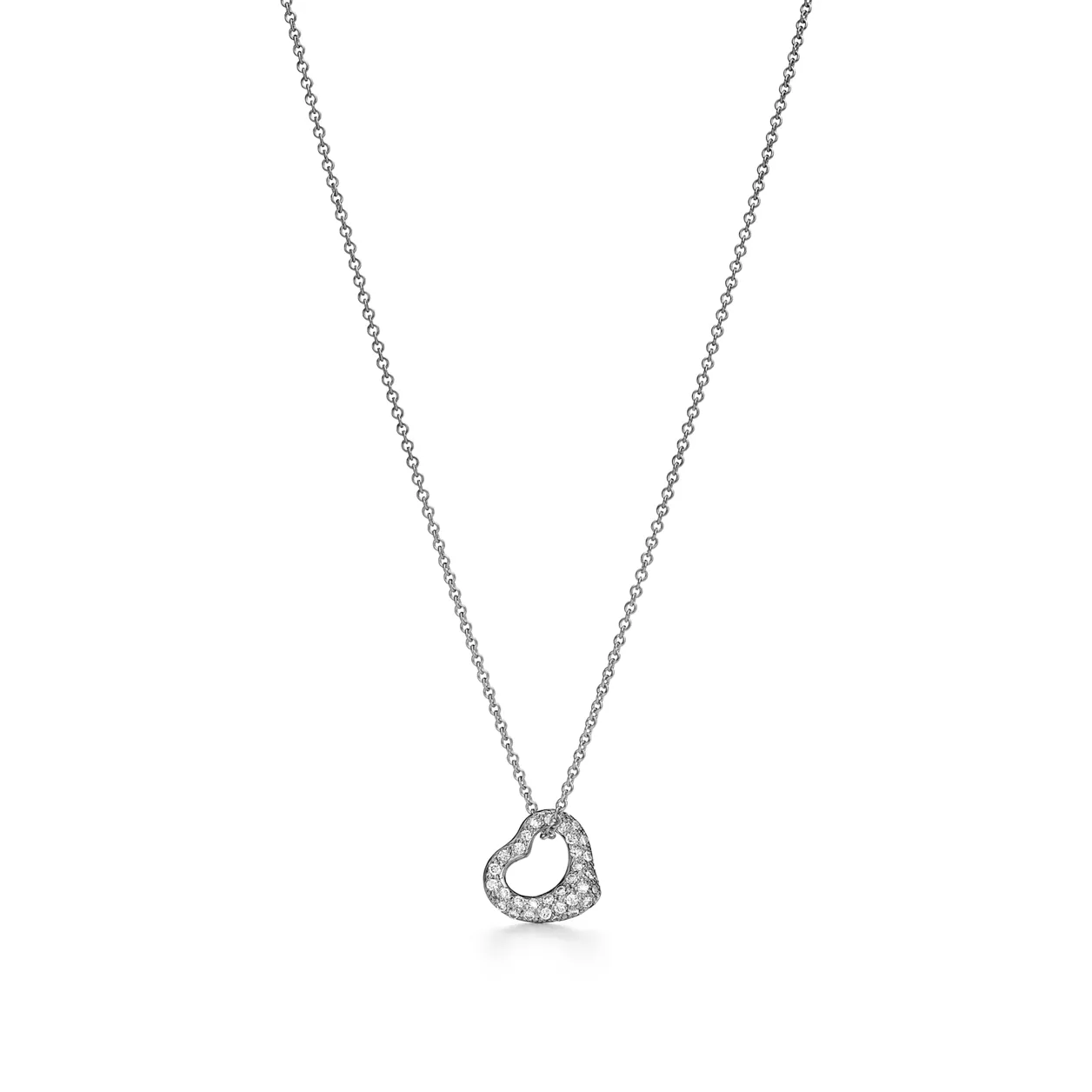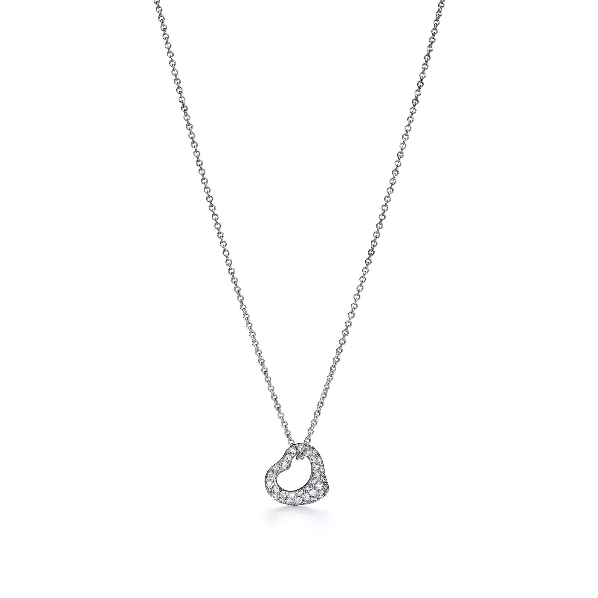 The simple, evocative shape of Elsa Peretti Open Heart designs celebrates the spirit of love. This chic style is one of her most iconic, expertly crafted in platinum with pavé diamonds. Layer this piece with pendants of varying lengths or wear as its own statement.