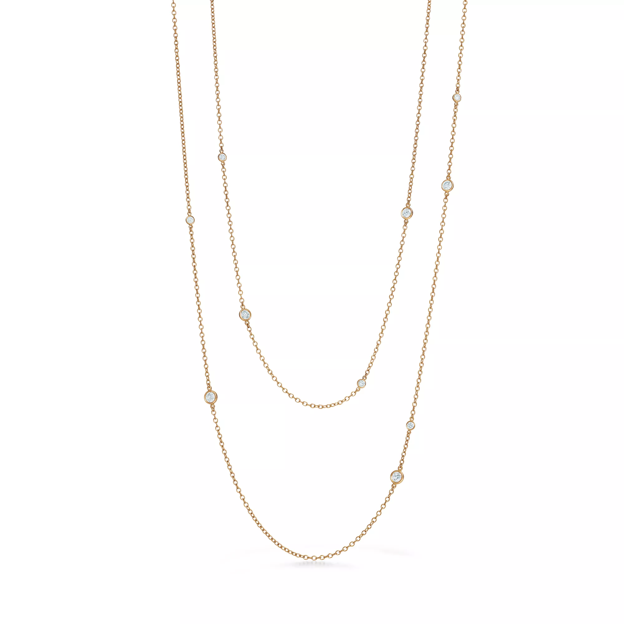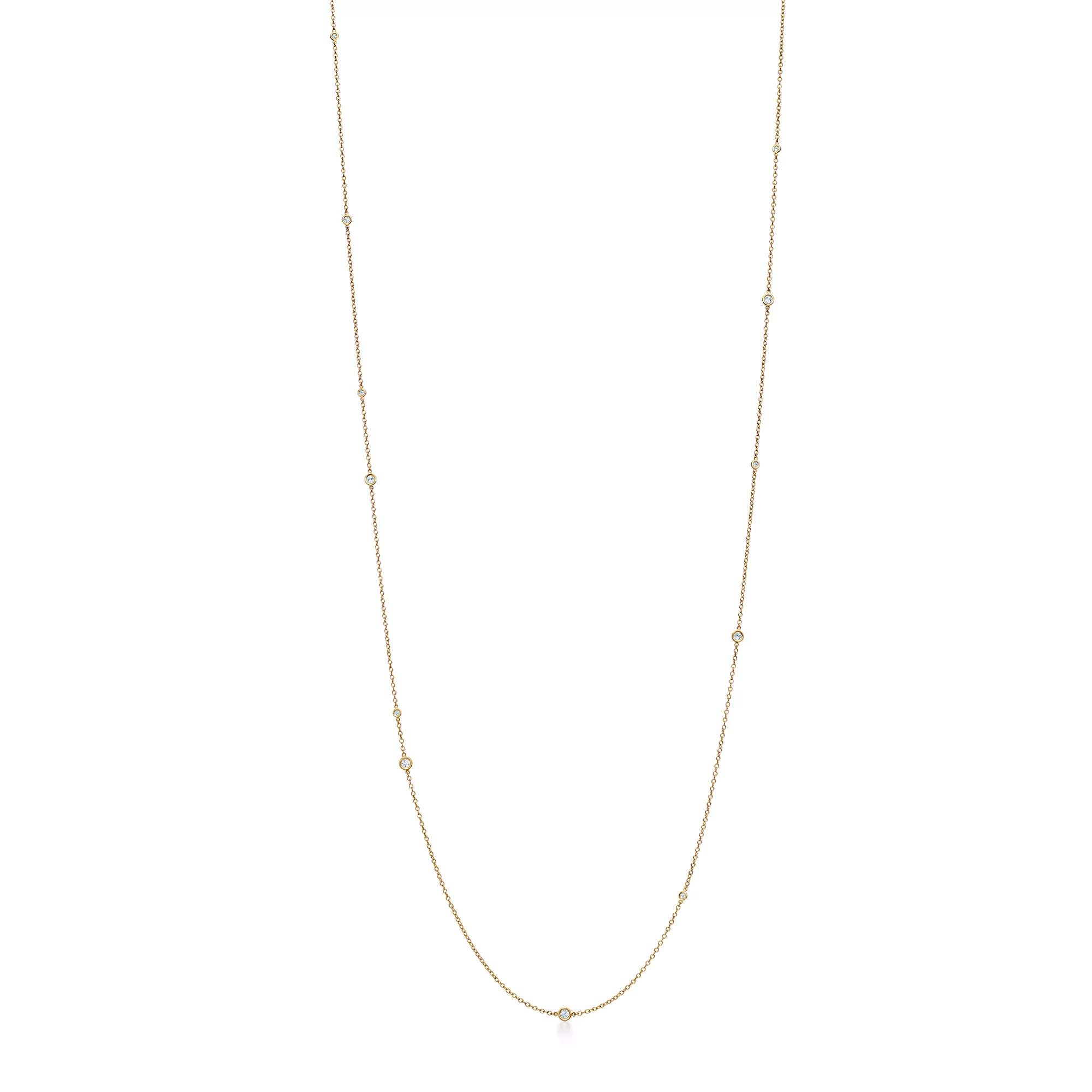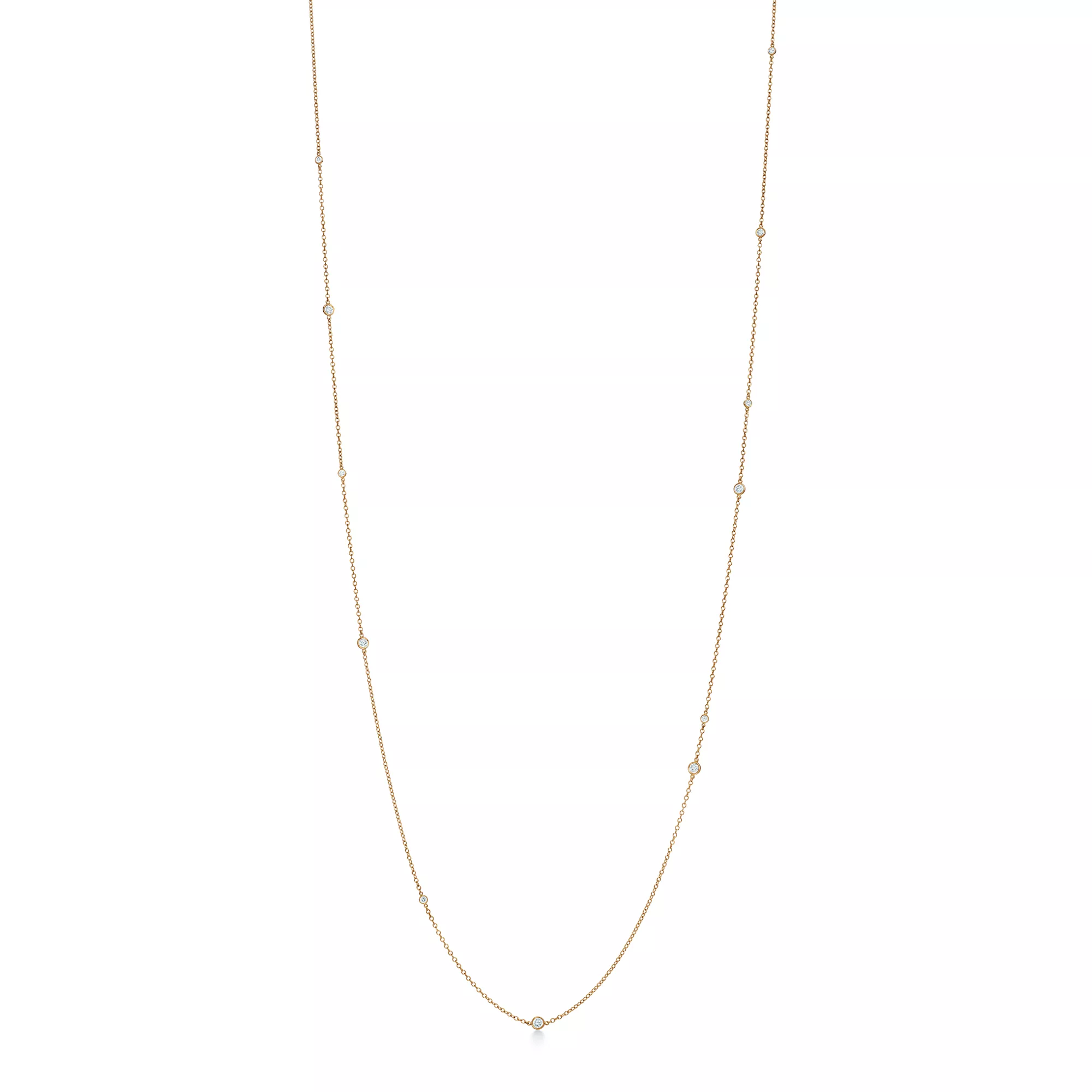 Tiffany round diamonds catch the light and make it dance. Sprinkle necklace in 18k gold with 12 round brilliant diamonds. 36" long. Carat total weight 1.21. Original designs copyrighted by the Nando and Elsa Peretti Foundation.