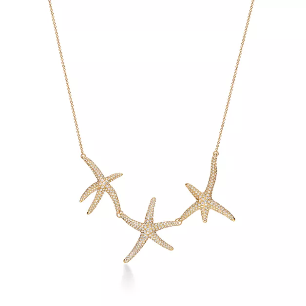 Elsa Peretti's Starfish design is a striking interpretation of one of nature's oldest creatures. Evoking life beneath the ocean, each starfish has a distinct character and a fluid silhouette. Hand-set with pavé diamonds, this bold necklace represents Peretti's extraordinary attention to detail and passion for the finest craftsmanship.