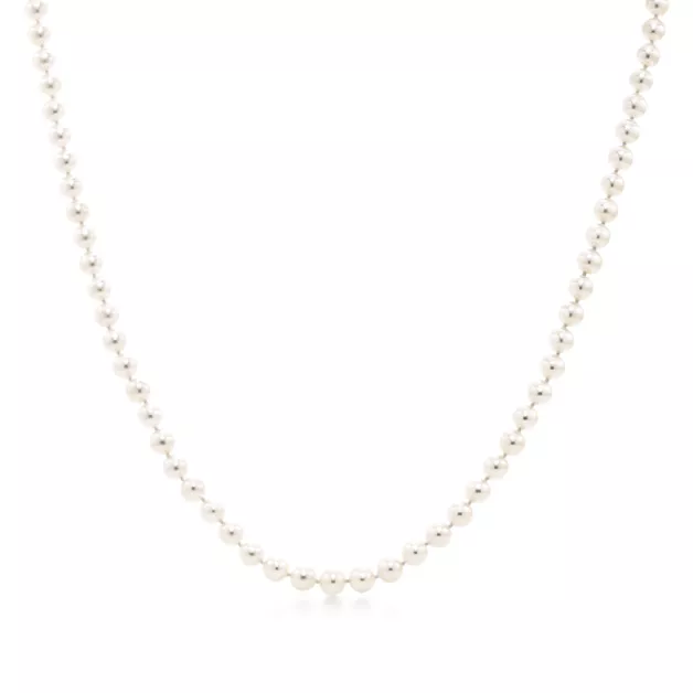 Necklace of Akoya cultured pearls with an 18k white gold clasp. 18" long. Decorative tag in 18k white gold is inscribed with "Tiffany & Co." in script. Pearls, 7-7.5 mm.