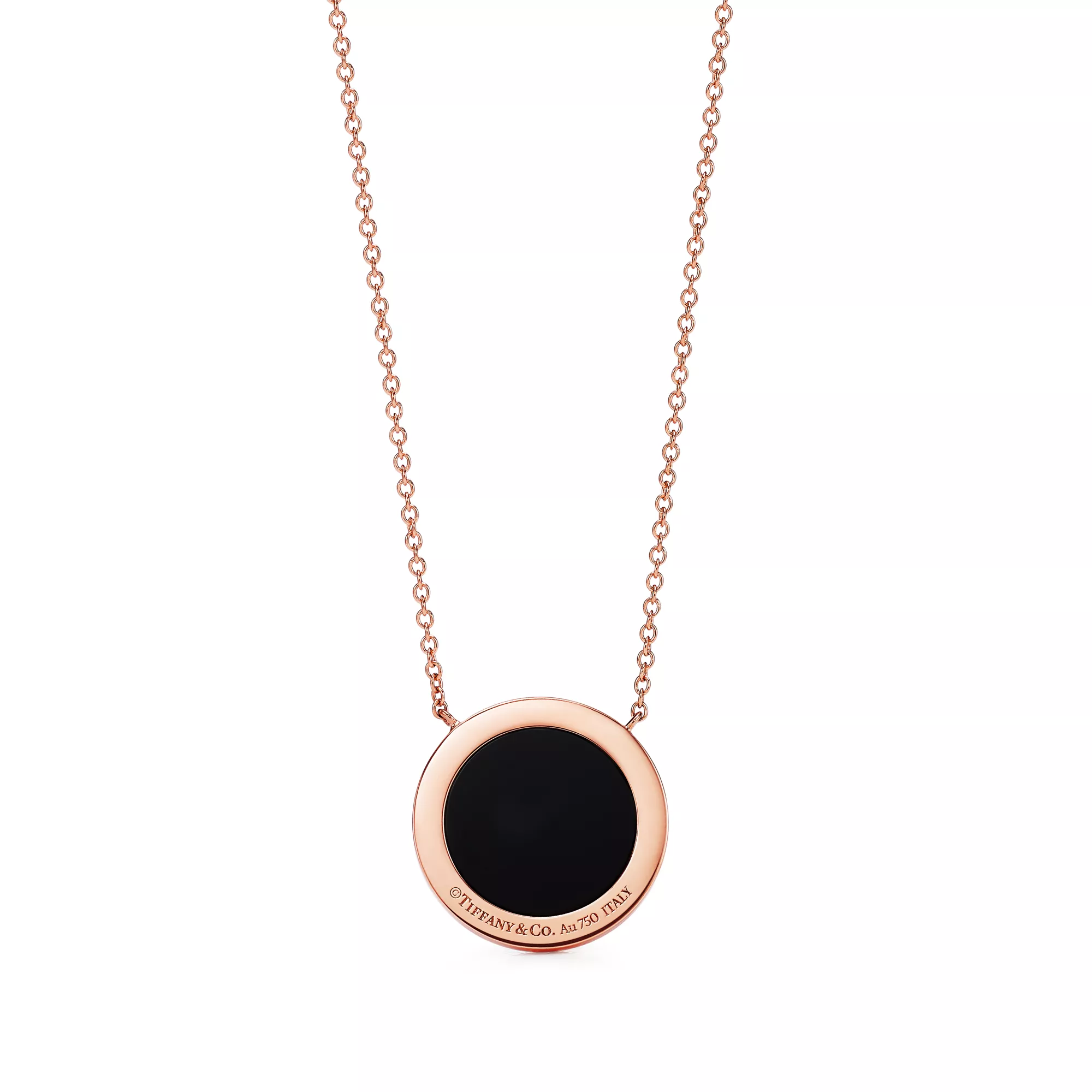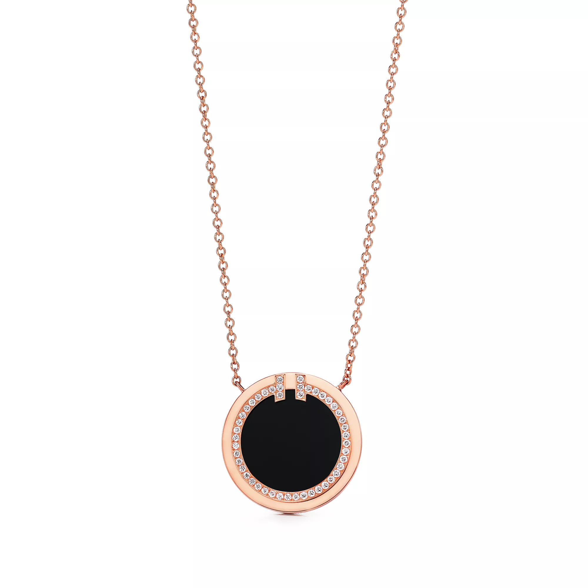 Tiffany T is an expression of love’s endless potential. Inspired by an archival bracelet from 1975, T is an homage to the House’s iconic motif and the spirit of New York, which founder Charles Lewis Tiffany regarded as the place of promise and possibilities. This circle pendant features black onyx, a unique variety of quartz found in nature. This striking pendant is traced with diamonds, resulting in a modern design with a smooth finish and high polish. Showcase your personal style by pairing this pendant with other Tiffany designs for a bold look.