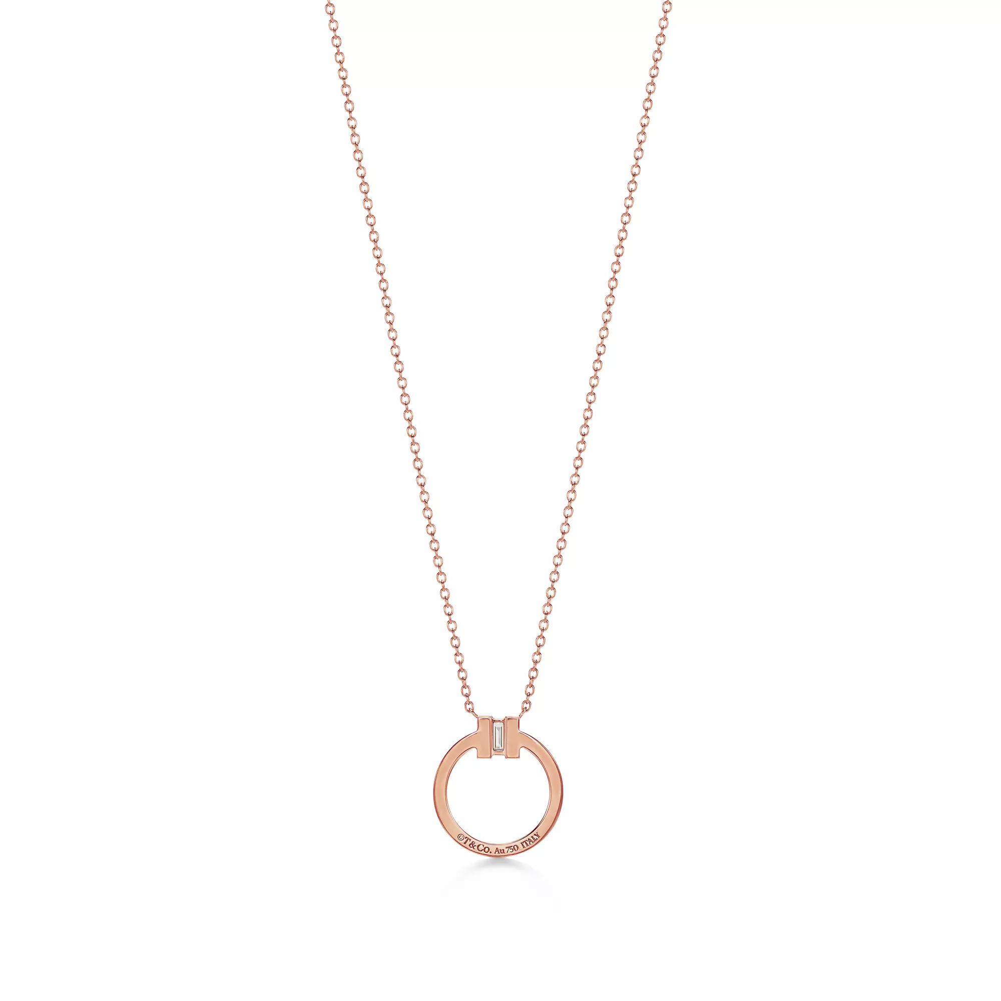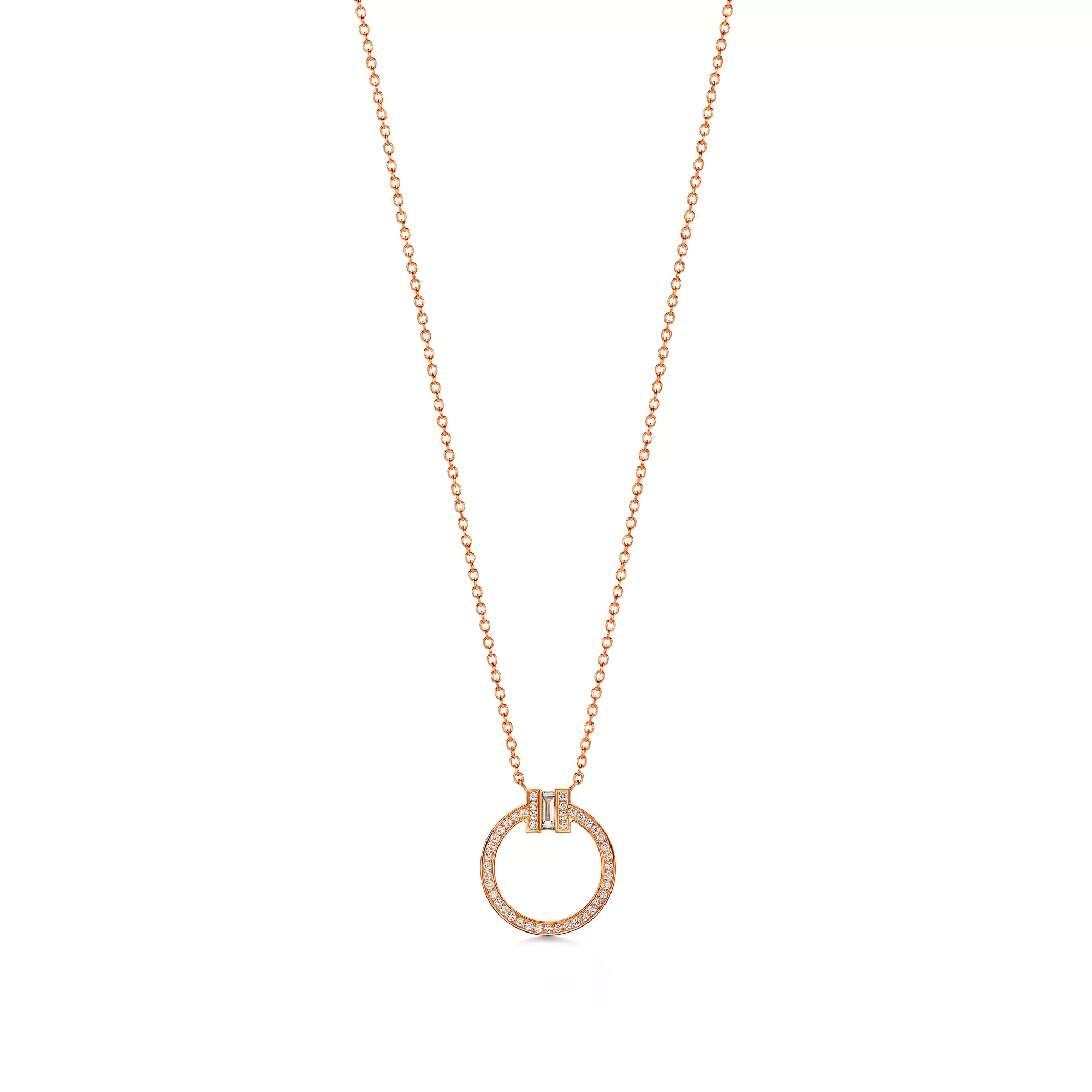 Tiffany T is an expression of love’s endless potential. Inspired by an archival bracelet from 1975, T is an homage to the House’s iconic motif and the spirit of New York, which founder Charles Lewis Tiffany regarded as the place of promise and possibilities. A baguette diamond shines at the centre of this bold circular pavé diamond pendant. Layer your collection of Tiffany pendants with this design for a striking style statement.