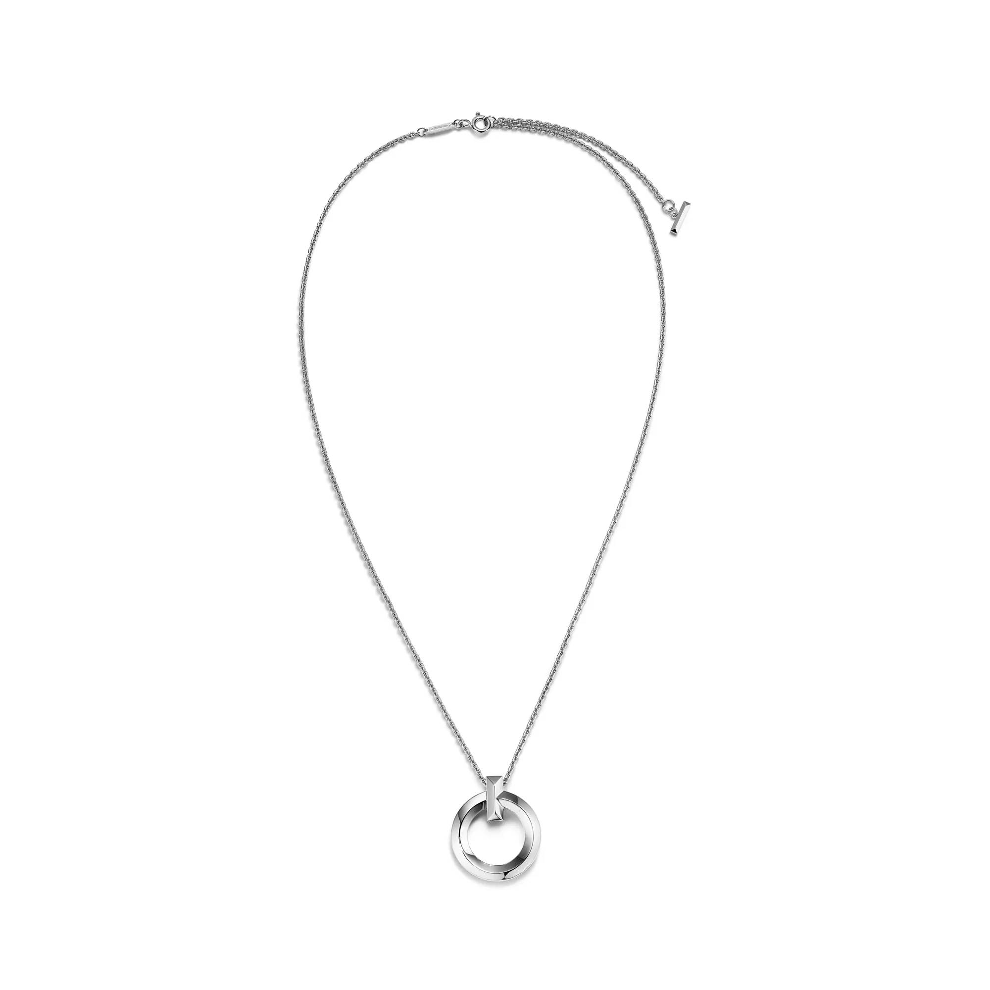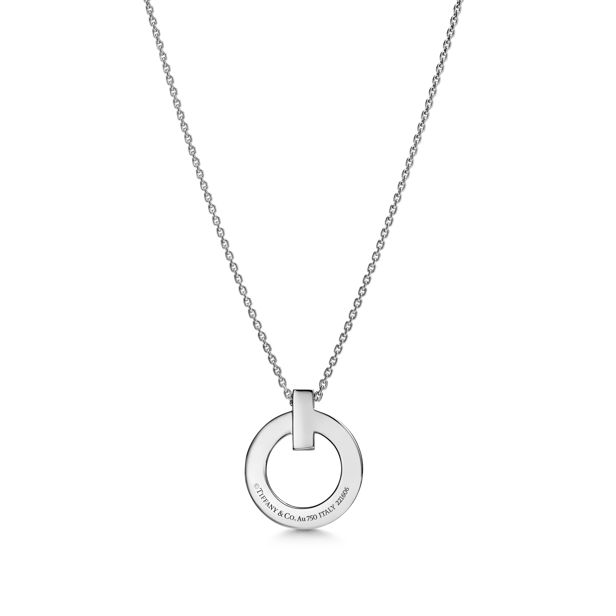 Tiffany T is an expression of love’s endless potential. Inspired by an archival bracelet from 1975, T is an homage to the House’s iconic motif and the spirit of New York, which founder Charles Lewis Tiffany regarded as the place of promise and possibilities. Precisely crafted in 18k white gold, this small circle pendant features a beveled edge that makes a striking statement. Wear it solo or layer with necklaces in different lengths for a distinctive look.