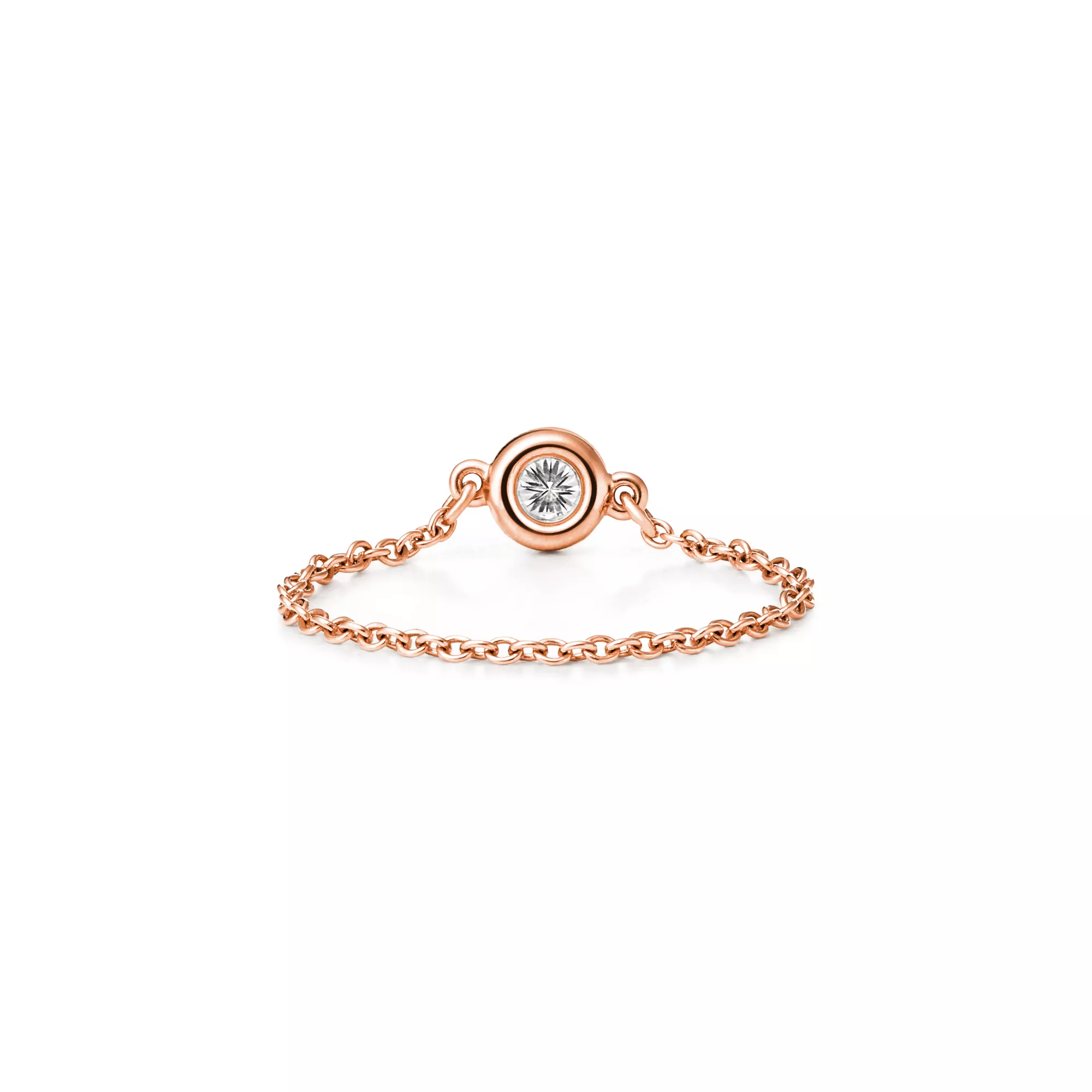 Tiffany round diamonds catch the light and make it dance. Ring in 18k rose gold with a round brilliant diamond. Carat weight .07. Original designs copyrighted by the Nando and Elsa Peretti Foundation.