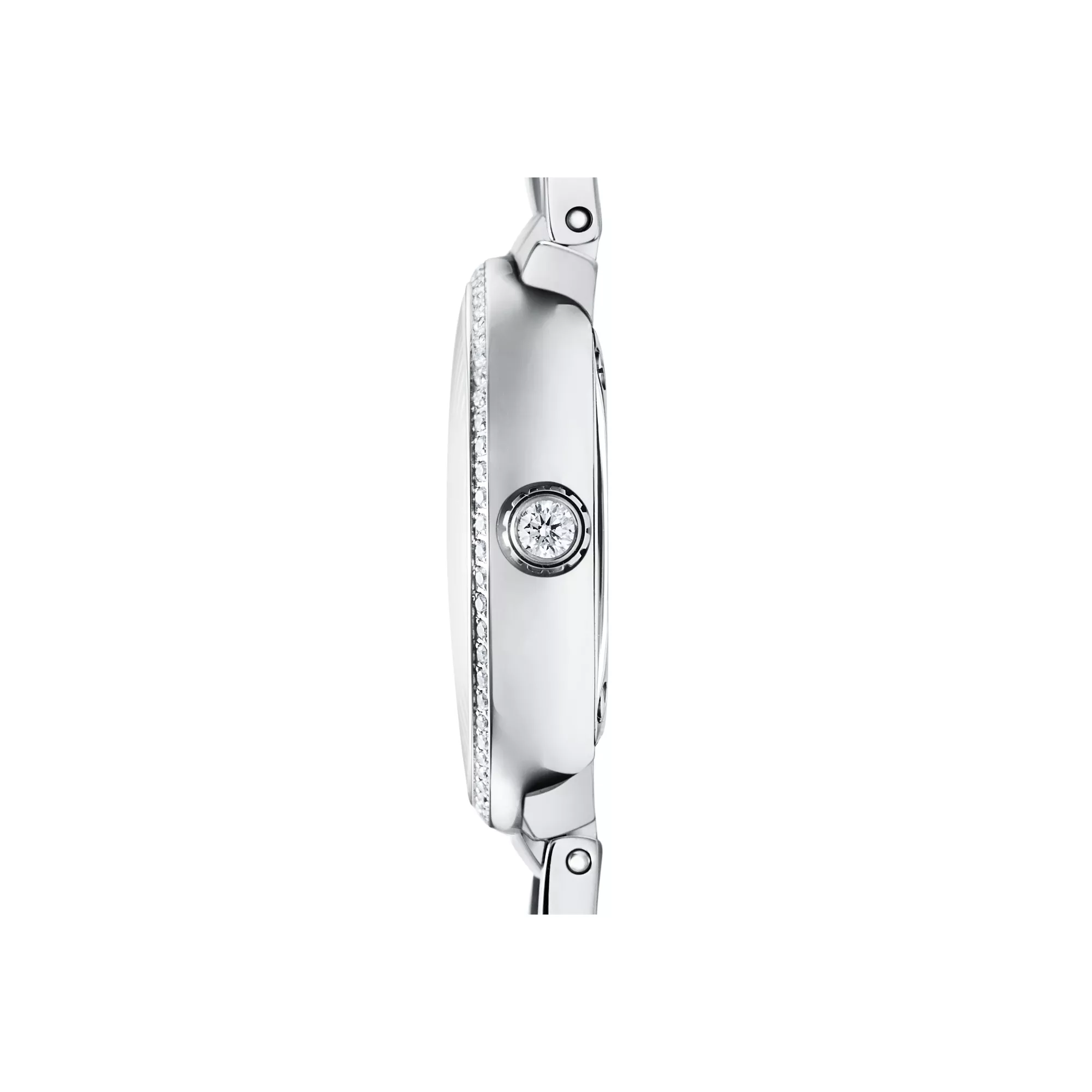 Women's watch in stainless steel. White dial set with round brilliant diamonds. Carat total weight .28. 24 mm case. Quartz movement. Water resistant to 30 meters/100 feet/3 ATM. Swiss-made.