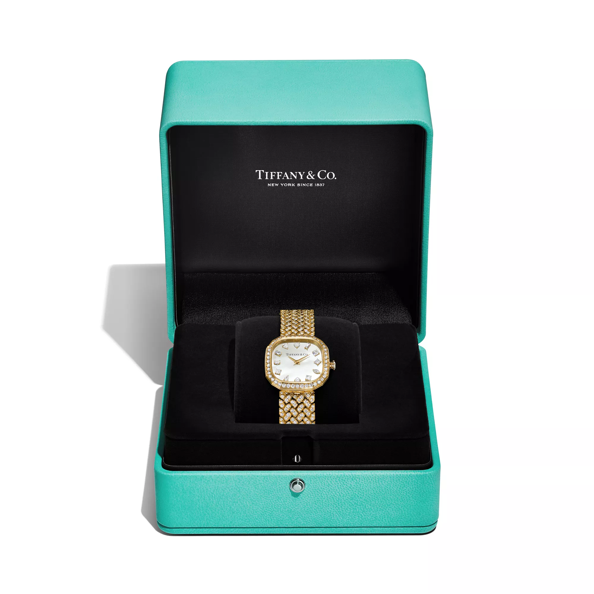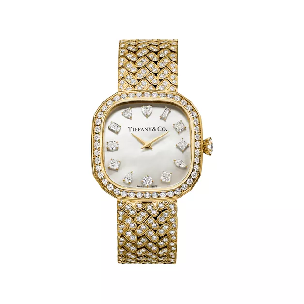 • Cushion-shaped white mother-of-pearl dial with 12 hand-set diamonds: one round brilliant diamond, one baguette diamond, one cushion-cut diamond, one Tiffany True® diamond, one marquise diamond, one Asscher-cut diamond, one heart-shaped diamond, one pear-shaped diamond, one oval diamond, one emerald-cut diamond, one triangular diamond and one princess-cut diamond